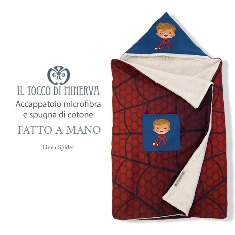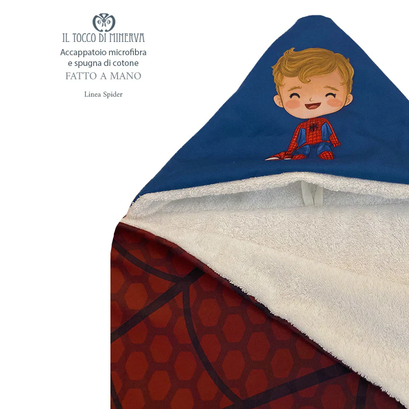 Accappatoio neonato realizzato a mano con tessuto di microfibra e Spugna di cotone. E’ molto morbido e dalla struttura corposa. L’accappatoio è un rettangolo dotato di un cappuccio rivestito da tessuto 100% cotone, con fantasia spiderman. L’accappatoio può essere utilizzato anche per il cambio del neonato fuori casa, perchè facile da piegare e mettere in borsa. Le dimensioni sono 135 cm x 67 cm. circa , più il cappuccio . Perfetta idea regalo nascita.