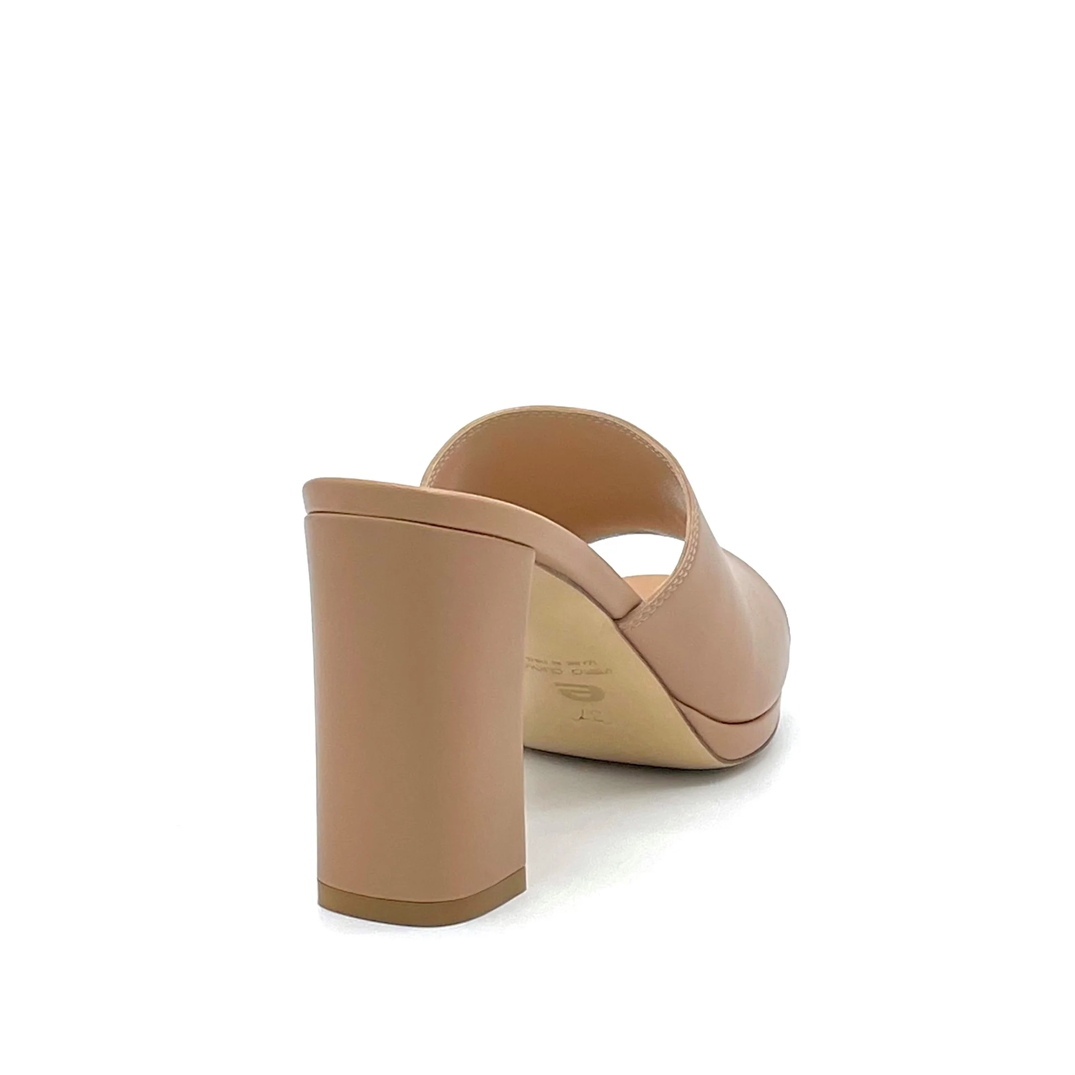 Mule in pelle beige scuro con plateau, con elastico nascosto sul lato interno. Fodera in pelle, suola in cuoio. Altezza tacco 8 cm e plateau 1 cm.