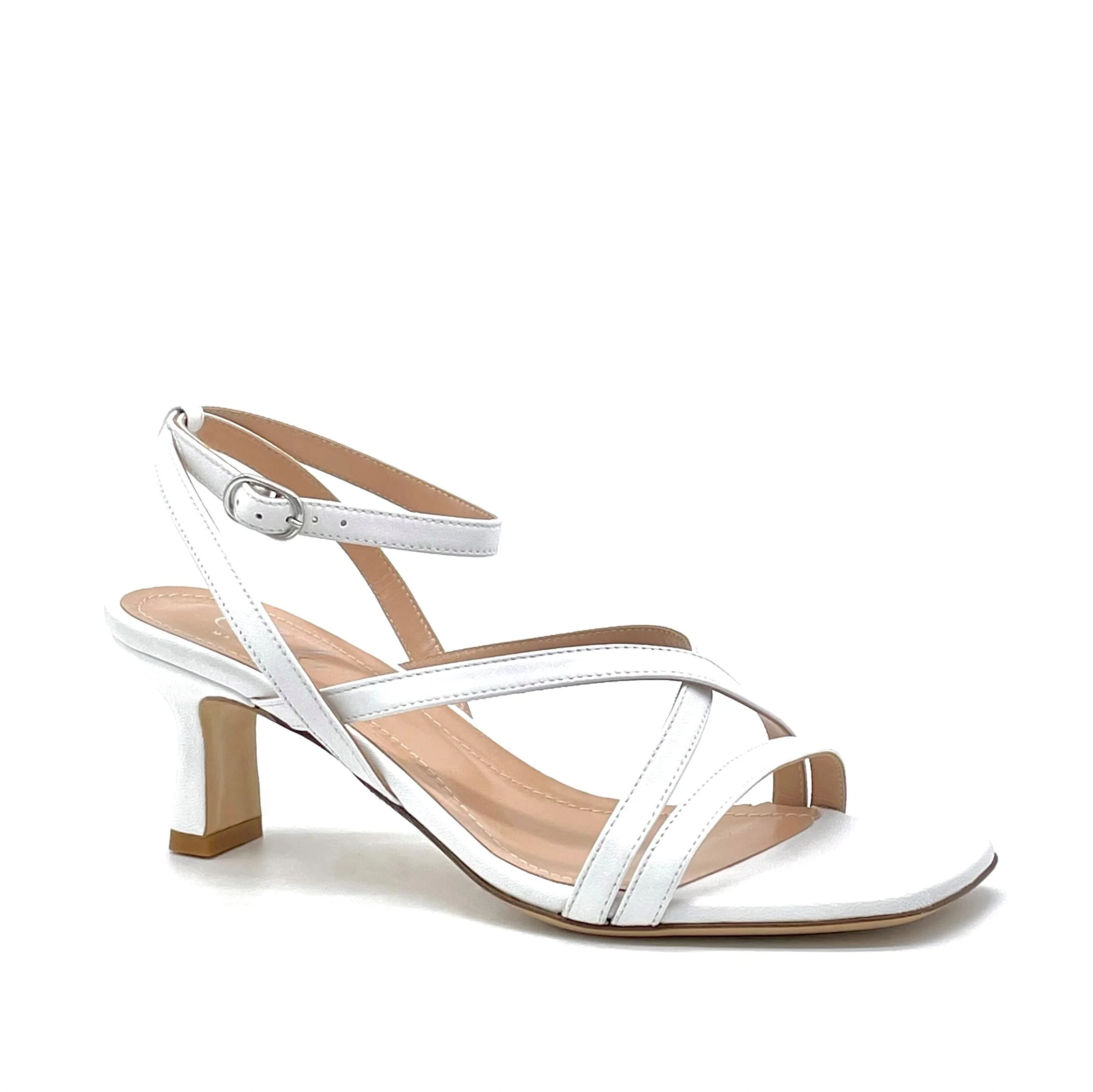 Sandalo in pelle bianca con cinturino alla caviglia. Fodera in pelle, suola in cuoio. Altezza tacco 5,5 cm.