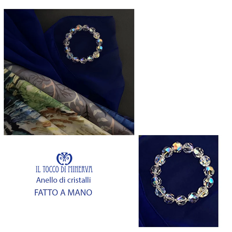 Anello fatto a mano con cristalli sferici da 10 mm. che raccorda foulard e stole , dando vita a fisionomie diverse di vestibilità delle stesse. Grazie all’anello sarà possibile indossare le stole o foulard in modalità sempre differenti.