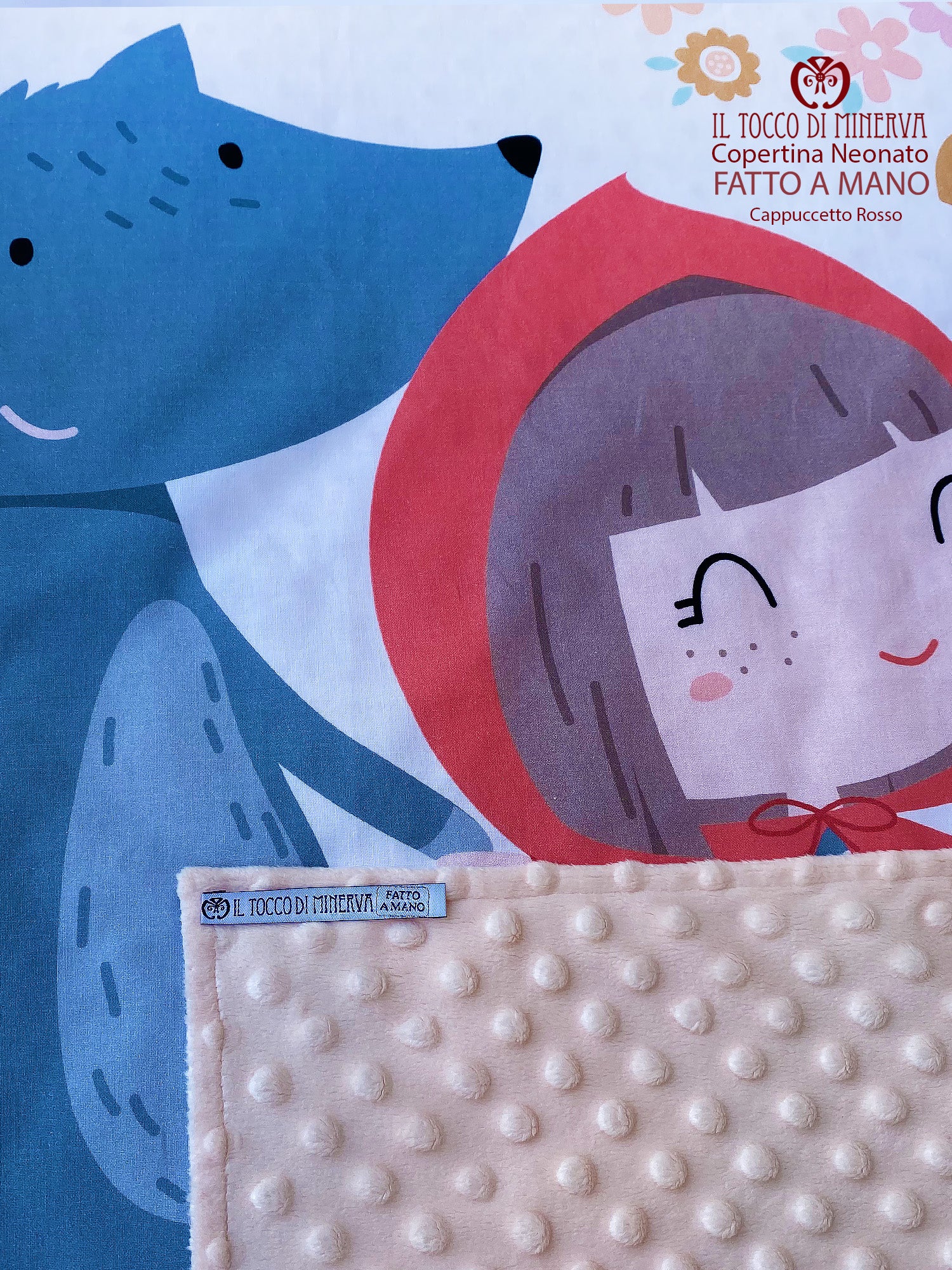 Copertina Neonato in Pile beige e Cotone Cappuccetto Rosso, fatta a mano. Un lato 100% cotone con la stampa di Cappuccetto Rosso. Un lato in pile beige, tessuto certificato, privo di sostanze nocive, sicuro e adatto per i piรน piccoli. Regalo perfetto per il bambino.