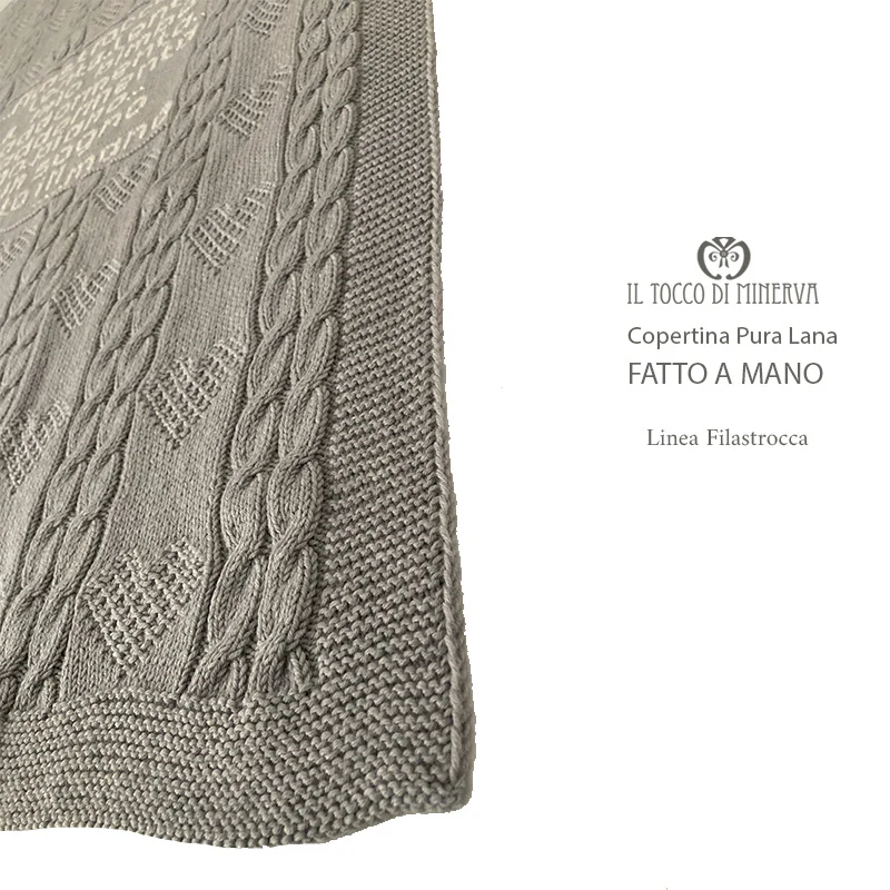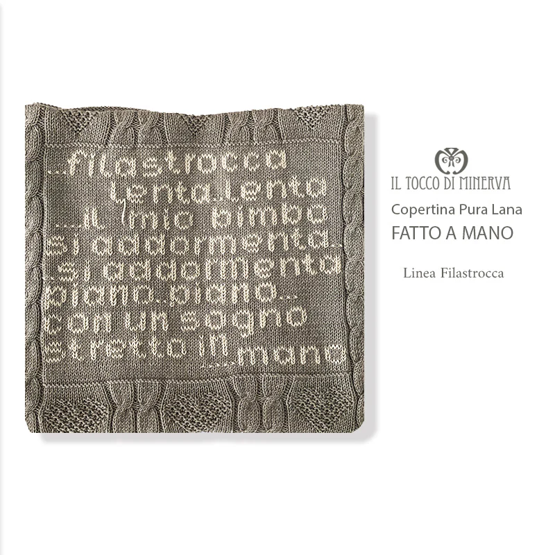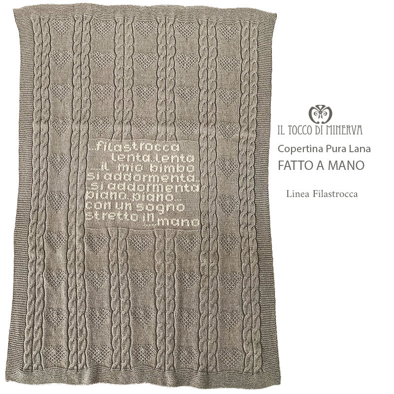 La copertina รจ lavorata e rifinita a mano. Si consiglia di lavare a mano la copertina 100% lana vergine merino. Ricamata a punto maglia, al centro ,con una filastrocca.