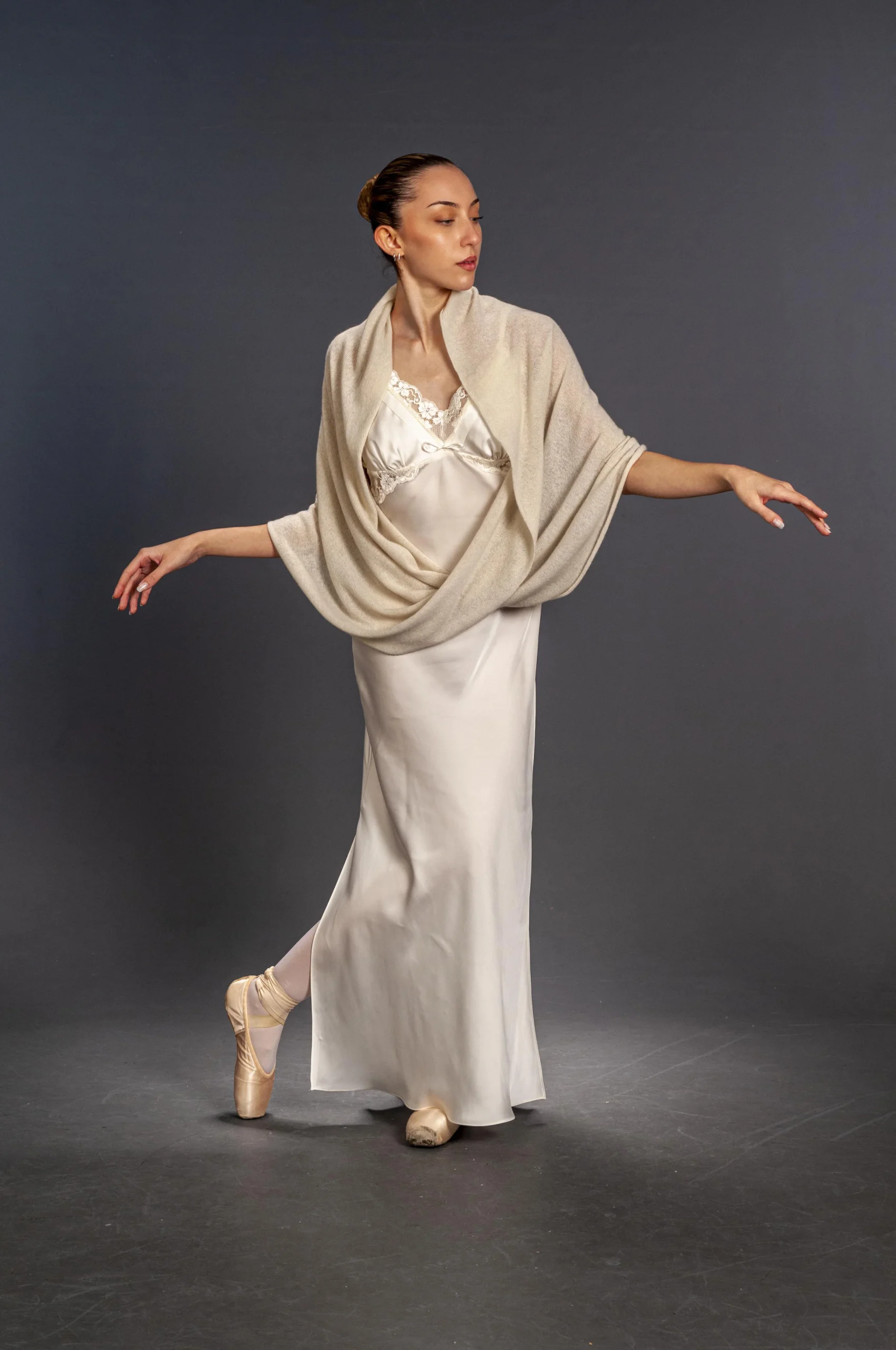 Avvolgiti nel nostro pregiato scialle in Cashmere 100% Loro Piana, realizzato a mano con amore a Roma e completamente Made in Italy. Questo scialle leggero ma caldo รจ l’accessorio perfetto per il tuo giorno piรน importante, esaltando la tua bellezza come un abbraccio sincero e affettuoso.