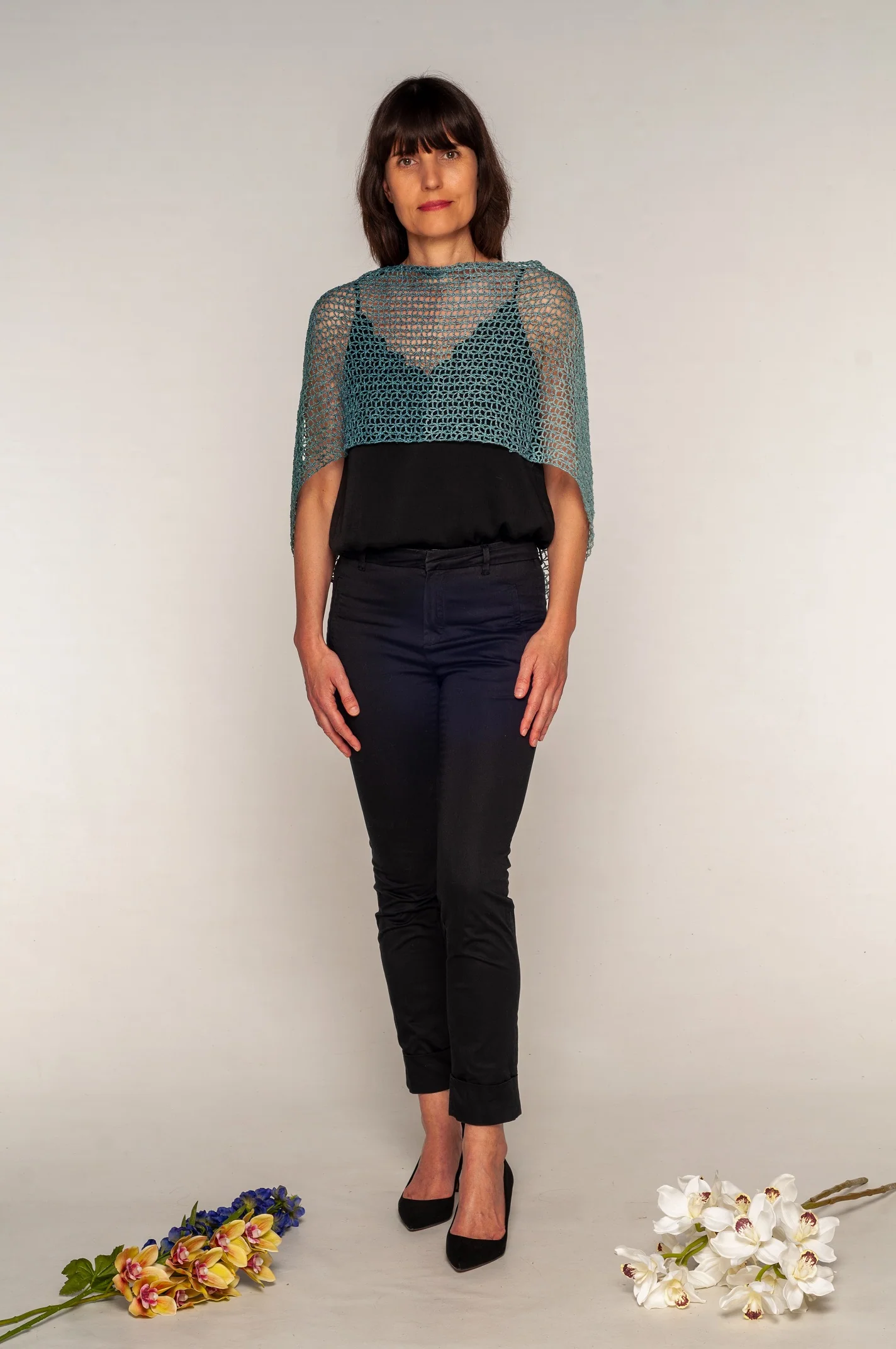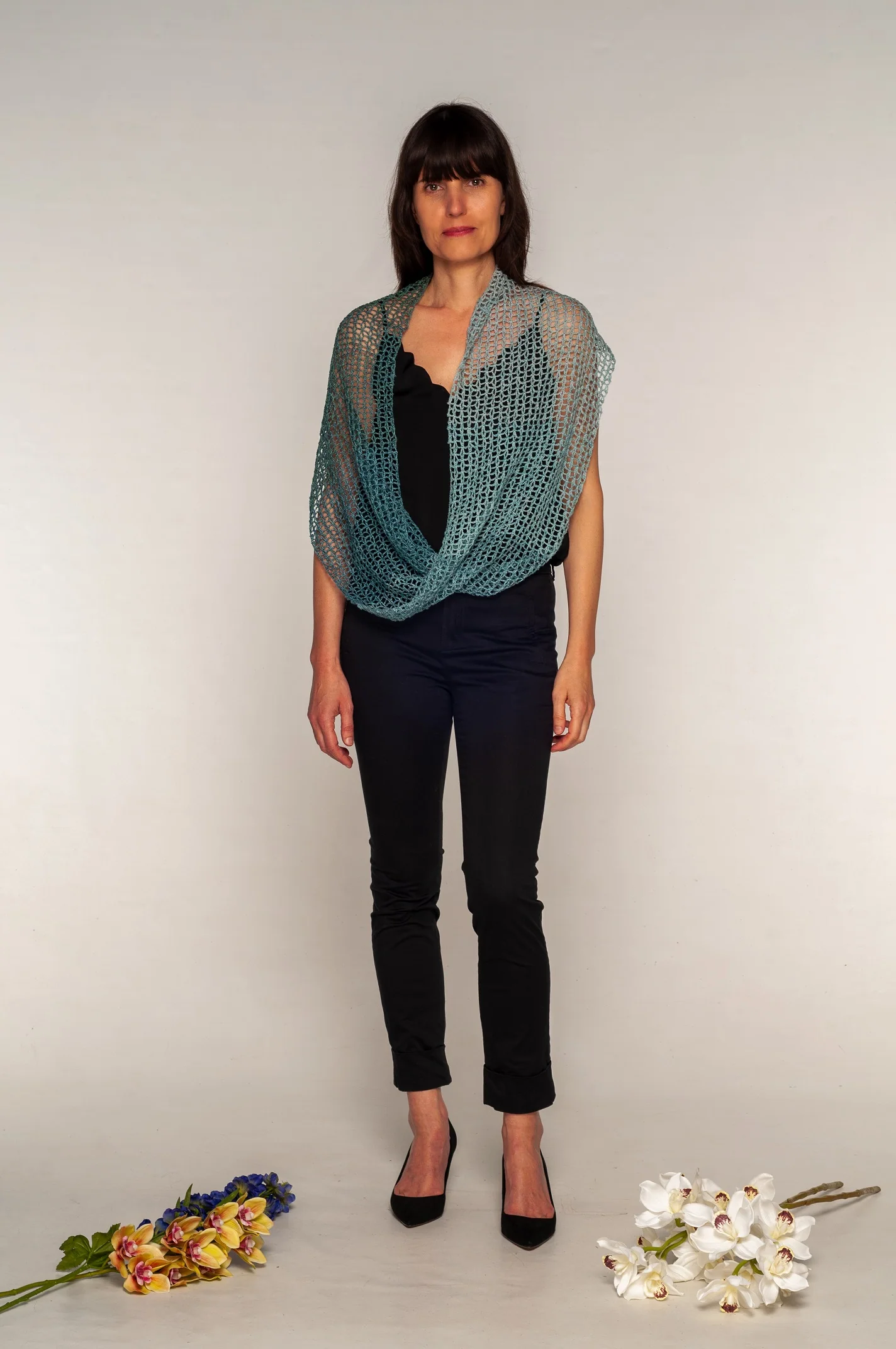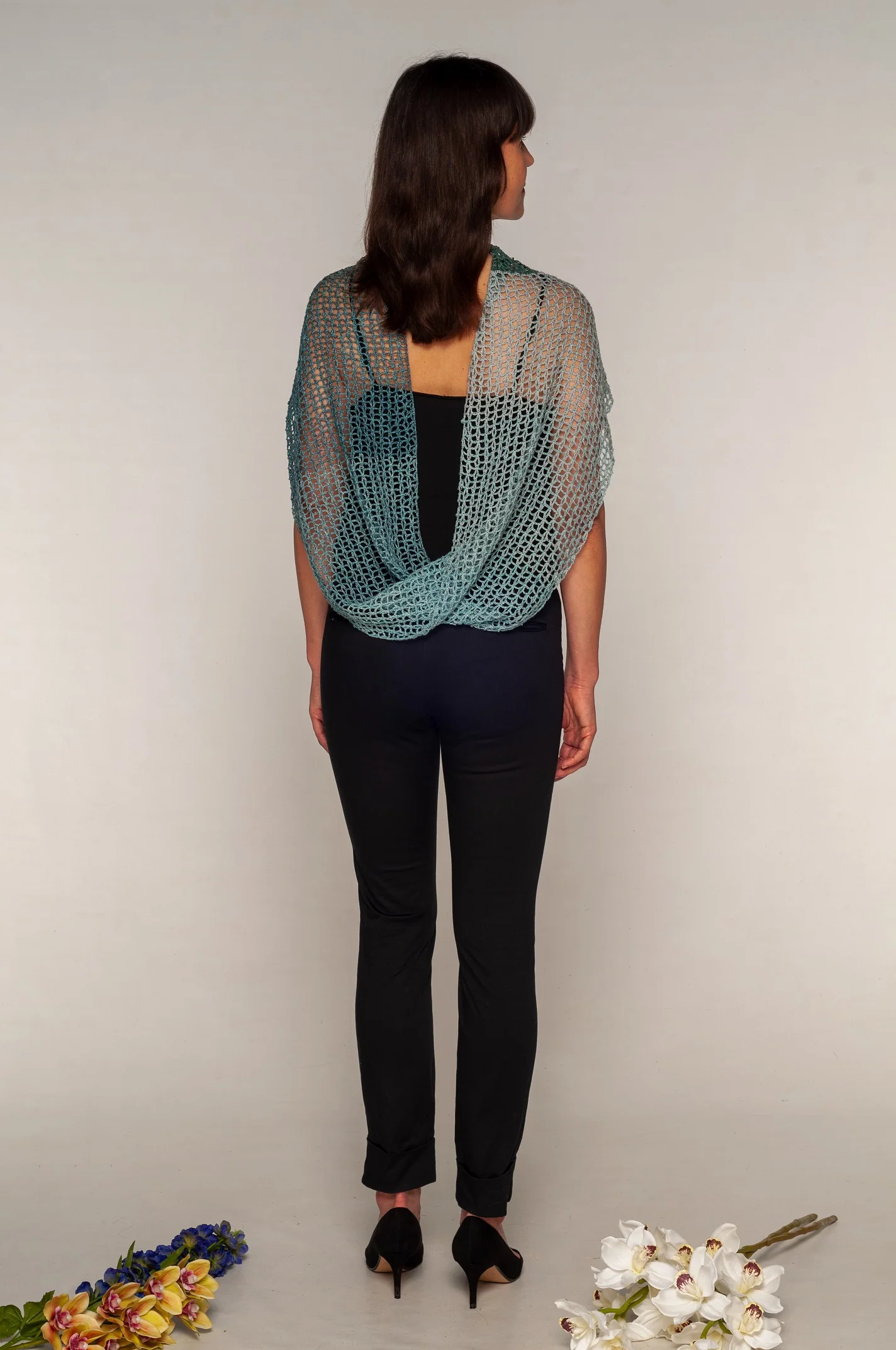 Avvolgiti nel nostro coprispalle in 100% lino, realizzato a mano all’uncinetto a punto rete a Roma con amore e completamente Made in Italy. Questo coprispalle leggero e fresco presenta una raffinata sfumatura che va dal celeste al blu ottano, perfetta per le sere d’estate.