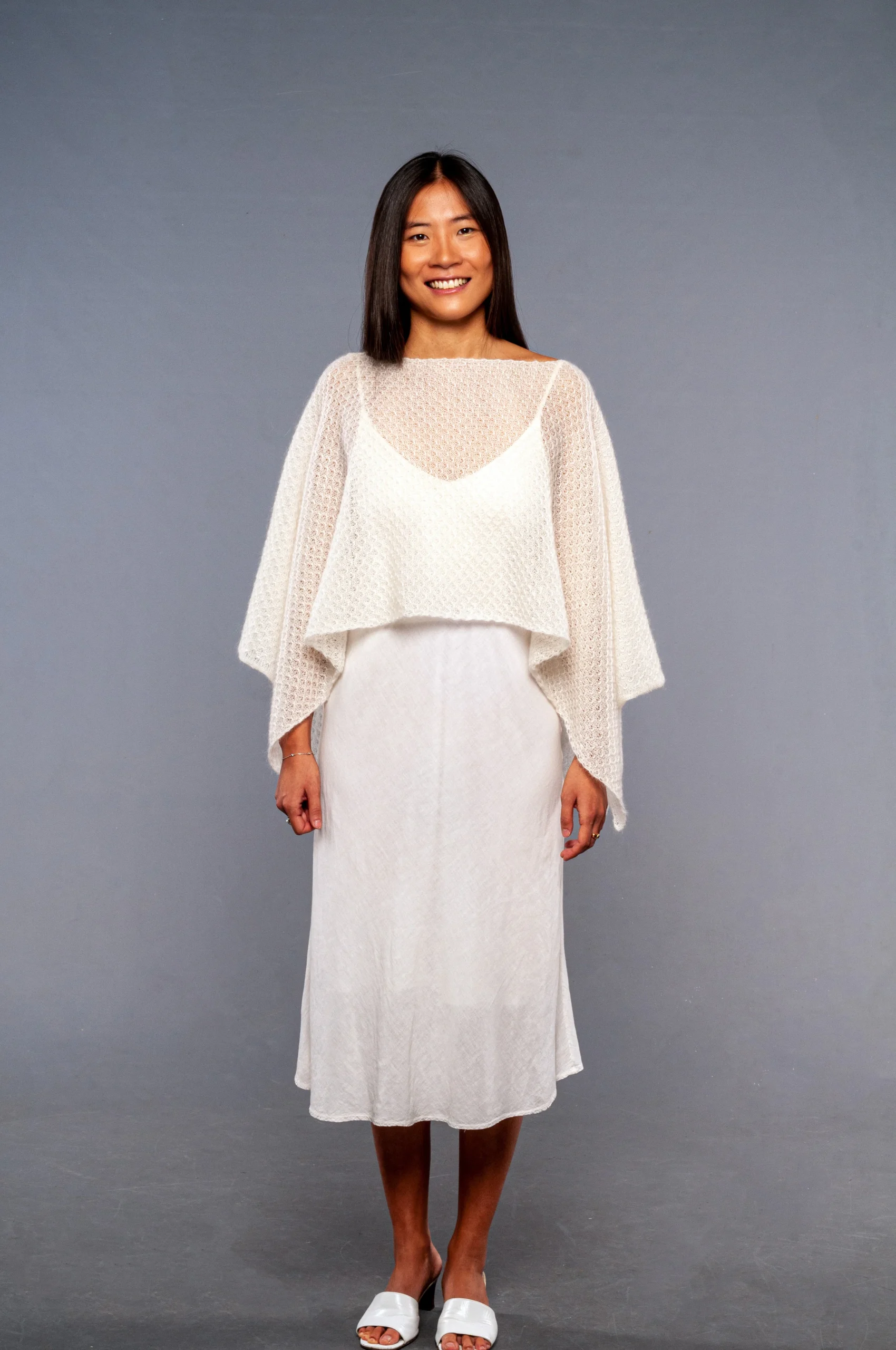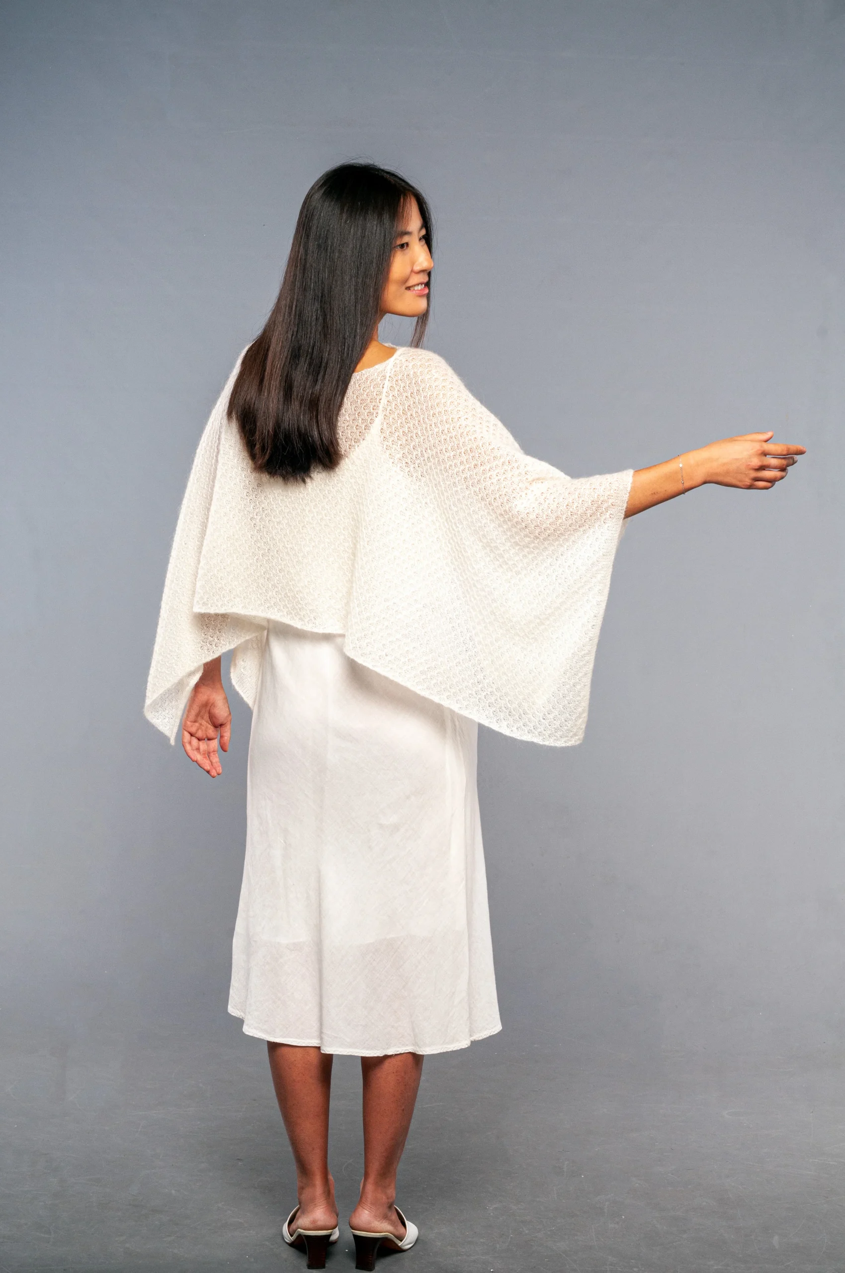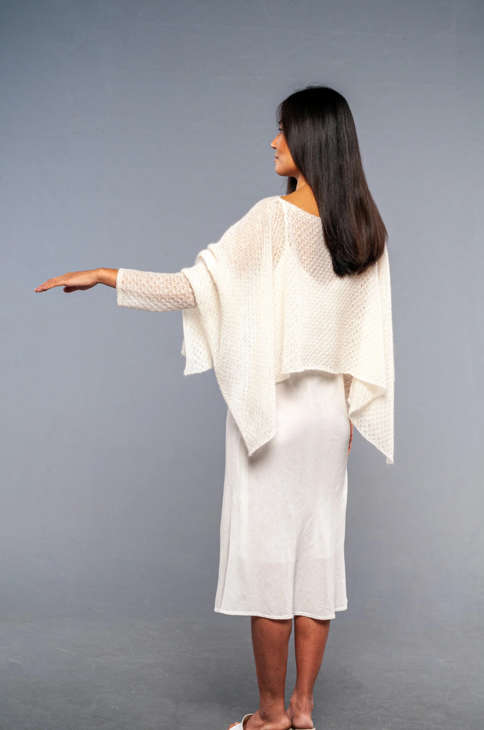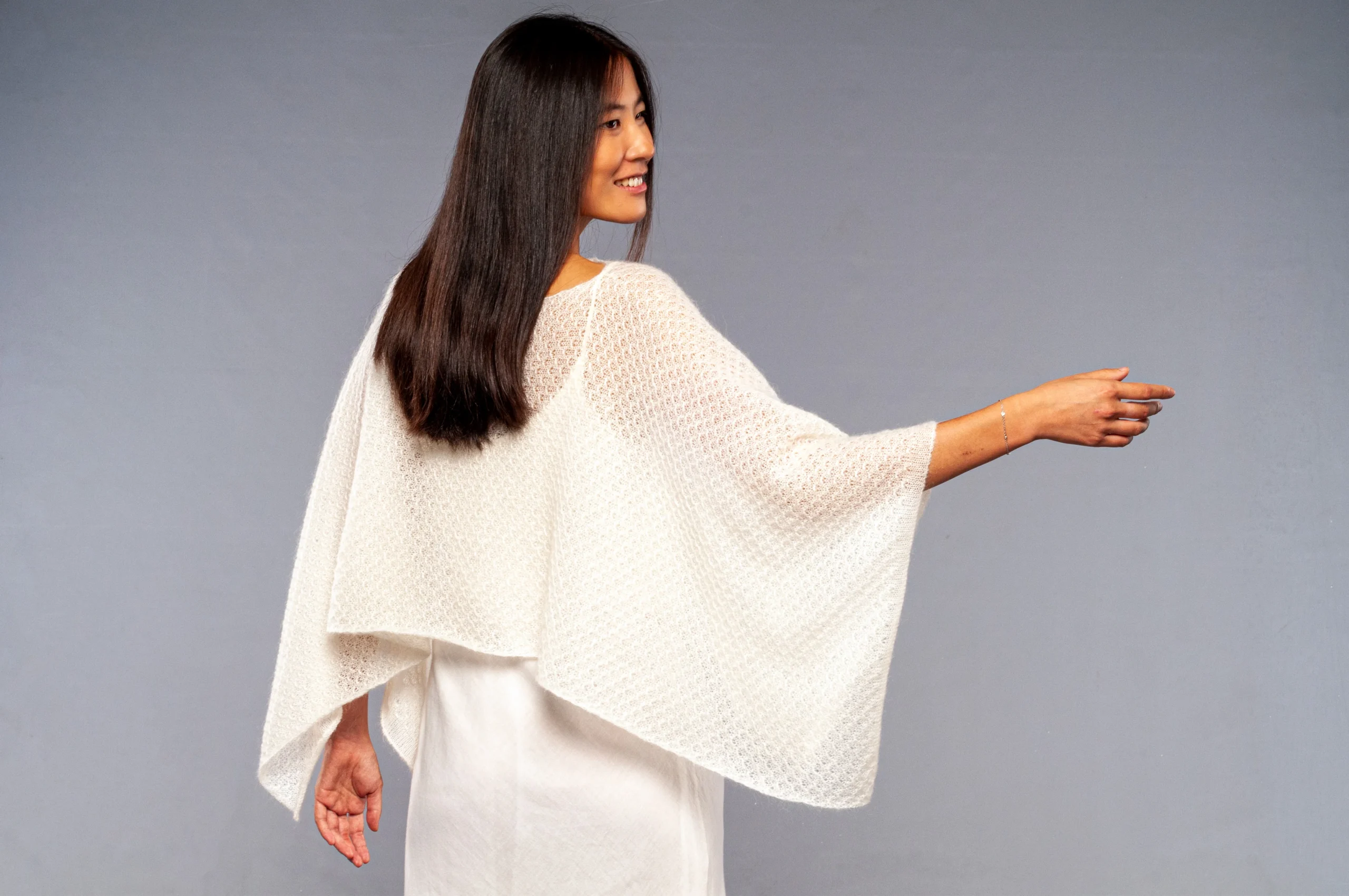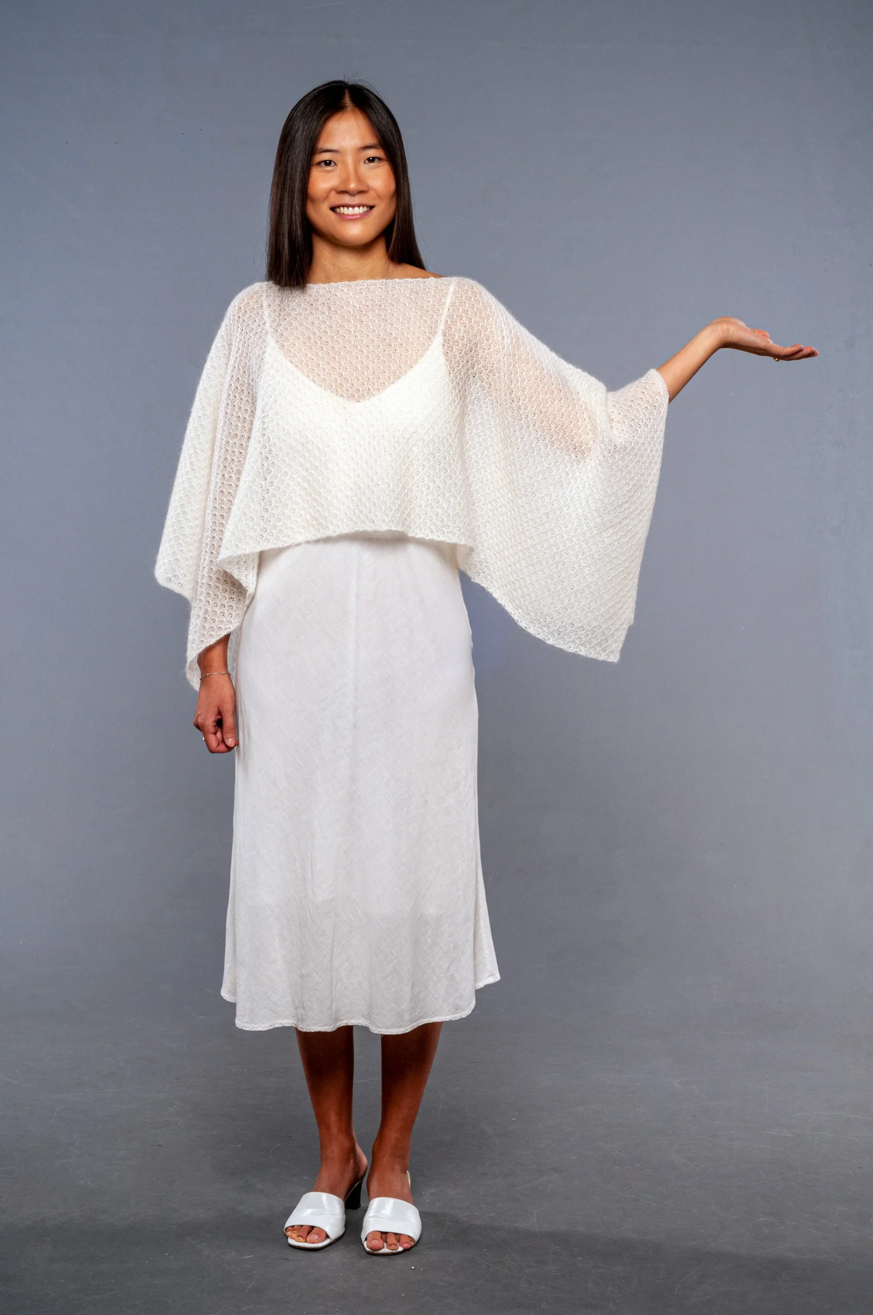 Avvolgente scialle in pregiato mohair e seta dalla forma rettangolare con manicotti aggiunti e separati. Puoi scegliere se indossare il coprispalle completo di manicotti per le occasioni piรน fredde o il solo coprispalle lasciando il tuo total look piรน essenziale.