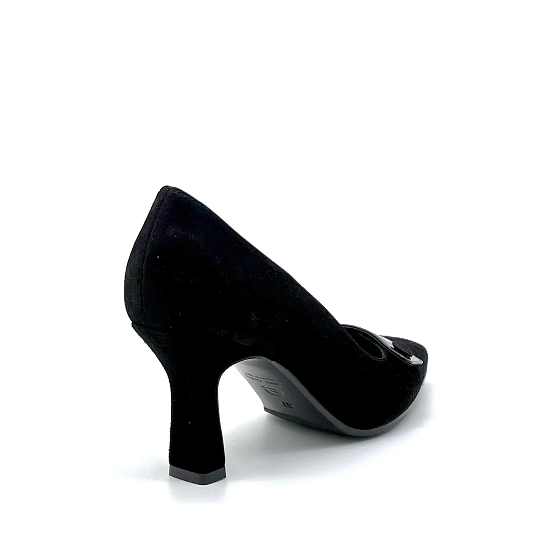Décolleté in camoscio e vernice nera con bottoncino foderato. Fodera in pelle. Suola in cuoio e gomma. Altezza tacco 7,5 cm.