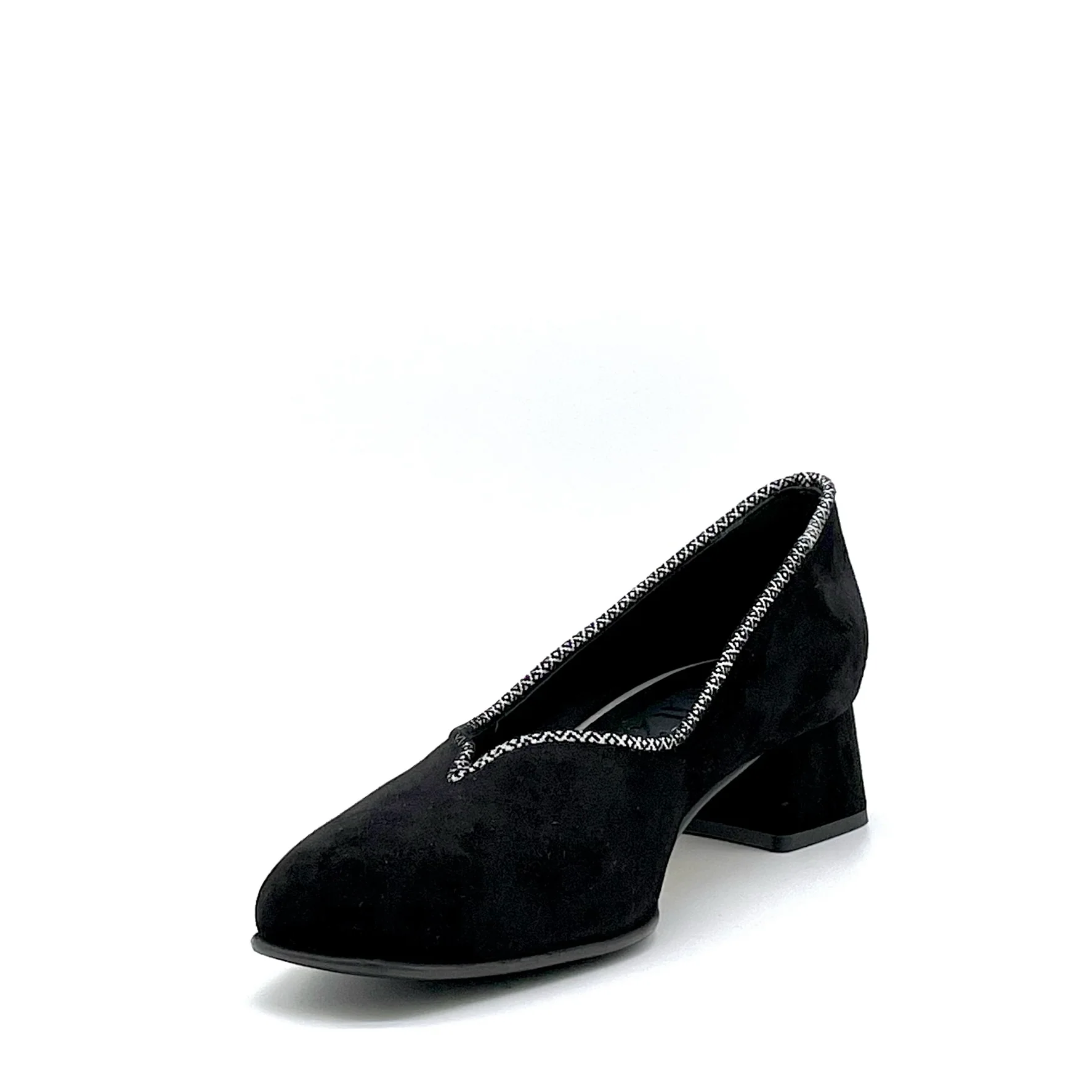 Décolleté in camoscio nero e inserti in camoscio stampato grigio e nero con soletta piuma – Cod. 74708