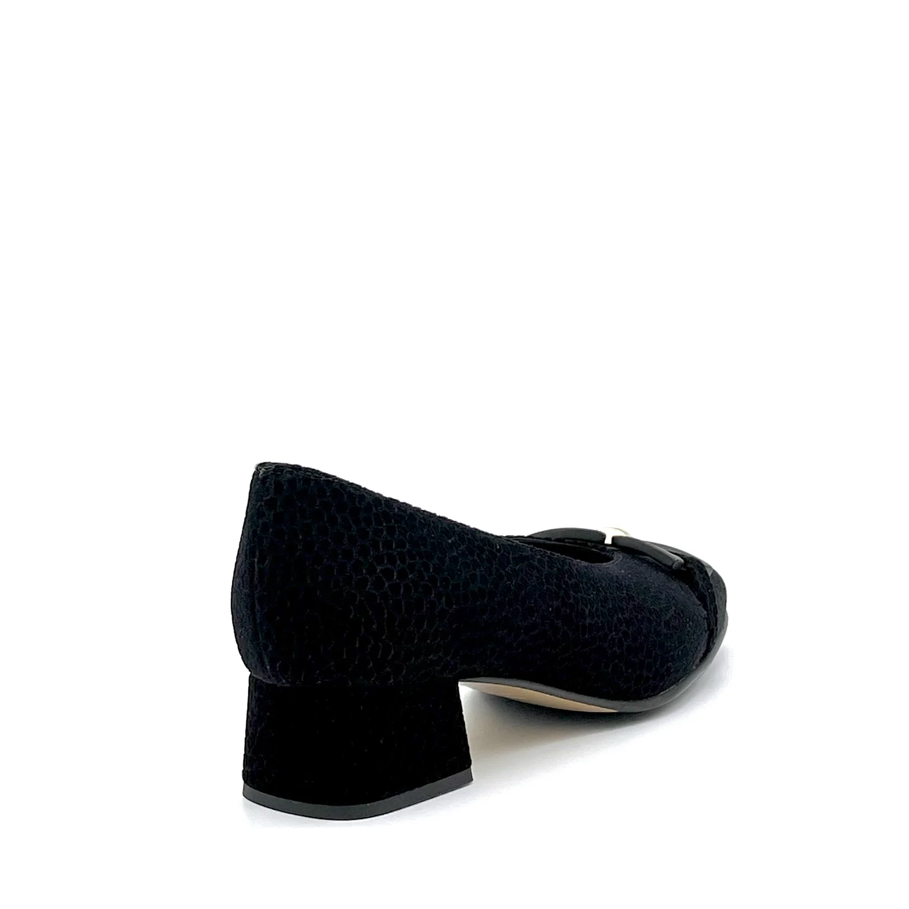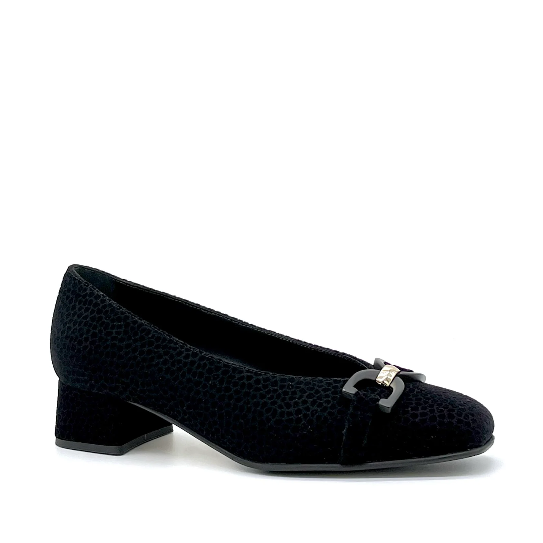 Décolleté in camoscio stampato nero con morsetto oro e soletta piuma – Cod. 74706