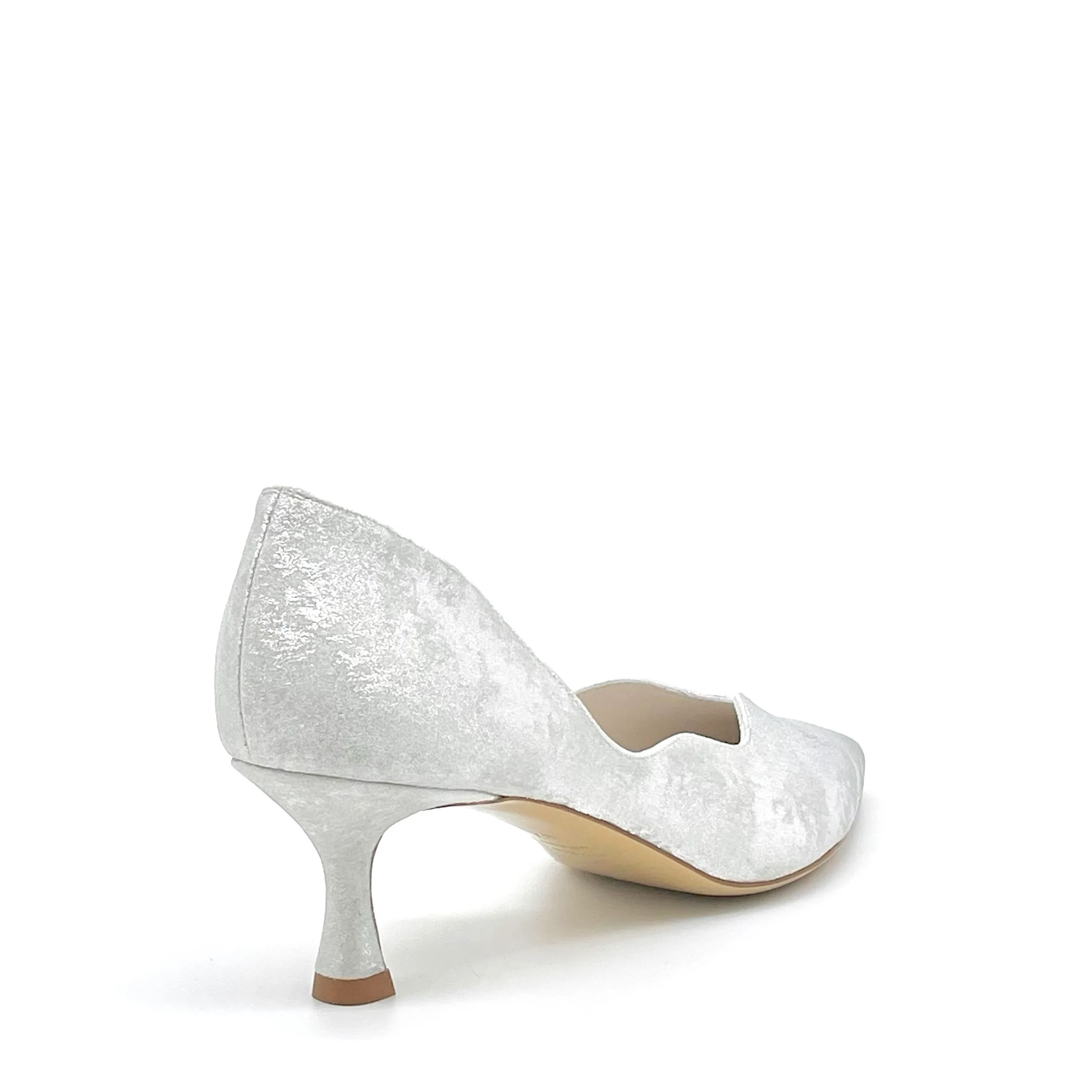 Décolleté in ciniglia satinata argento e apertura laterale. Fodera in pelle, suola in cuoio. Altezza tacco 5,5 cm.