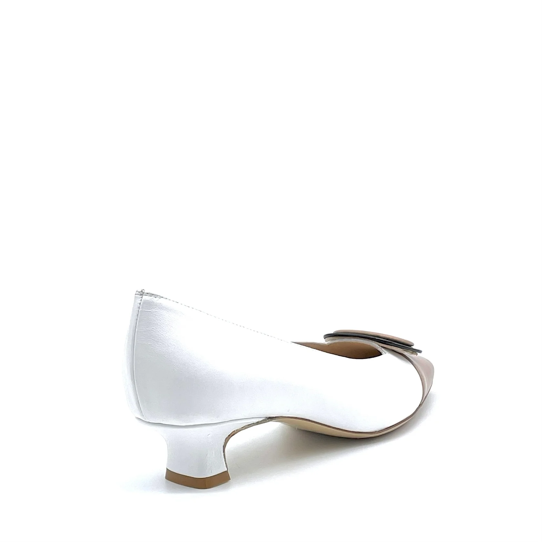 Décolleté in pelle bianca e color cannella con accessorio nero. Fodera in pelle, suola in cuoio. Altezza tacco 3,5 cm.