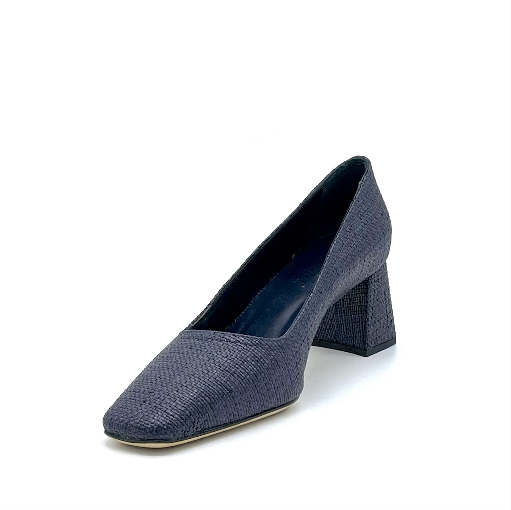 Décolleté in rafia bleu. Fodera in pelle, suola in cuoio. Altezza tacco 5,5 cm.
