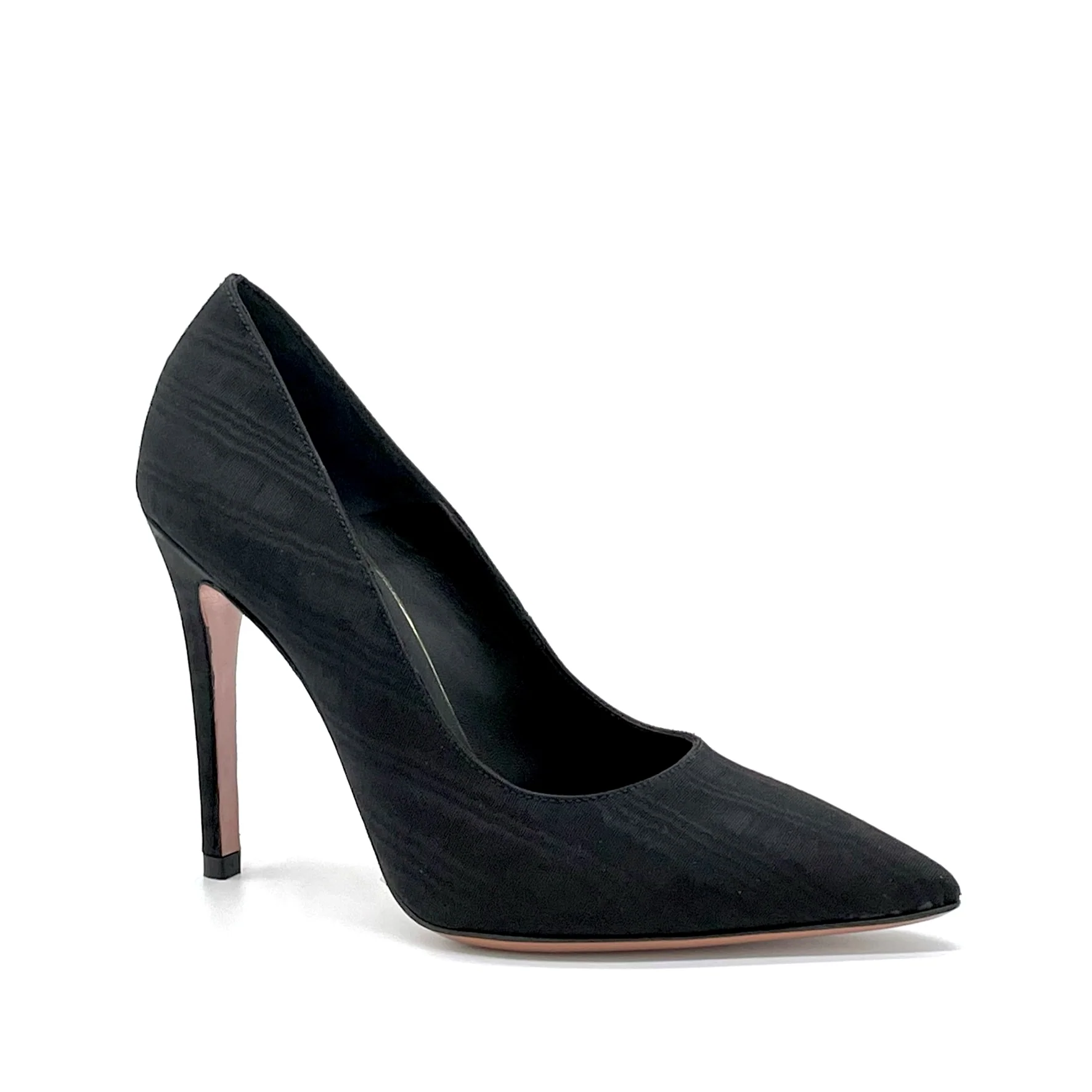 Décolleté in tessuto effetto ondulato nero. Fodera in pelle. Suola in cuoio. Altezza tacco 10,5 cm.