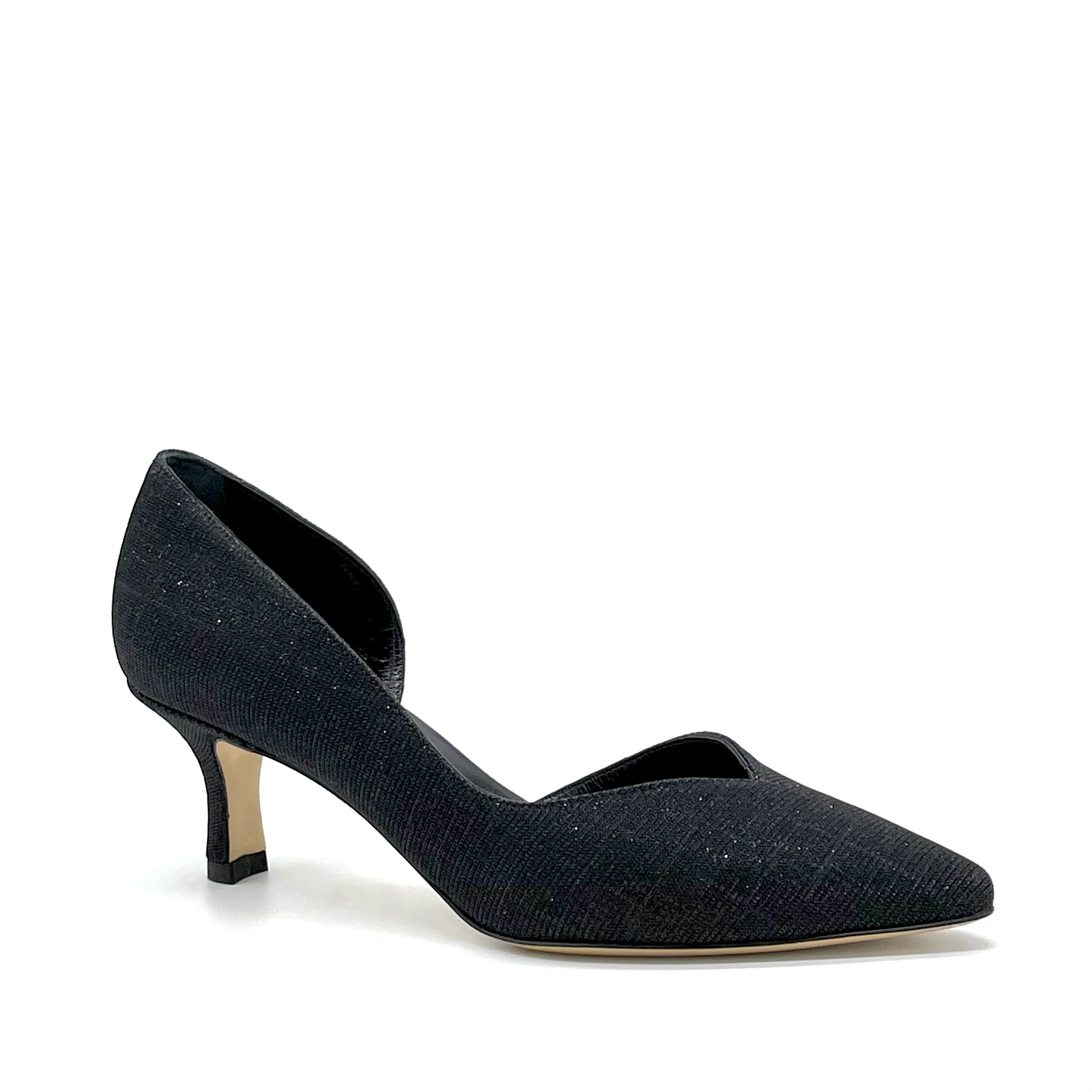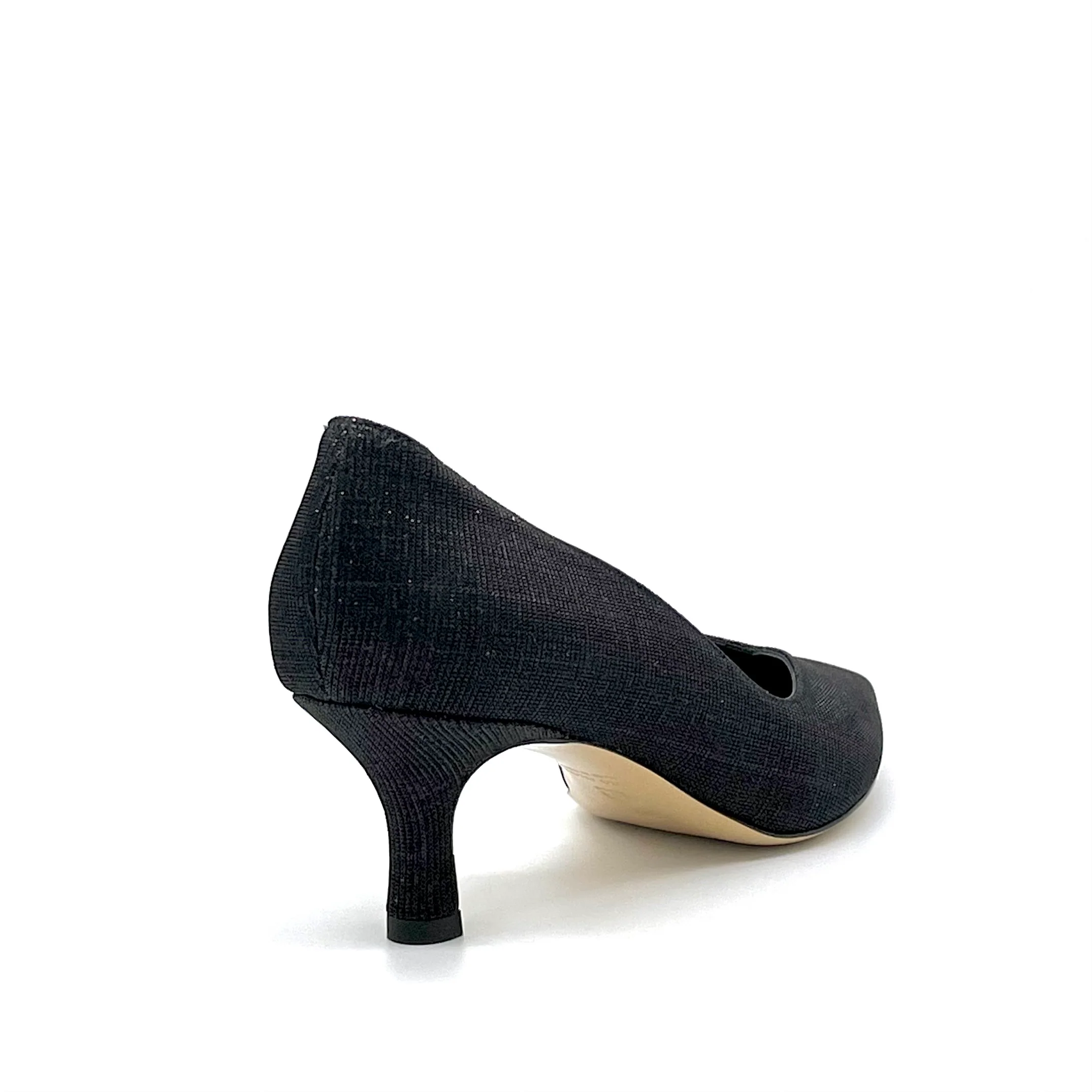 Décolleté in tessuto laminato nero con scollo a V, aperte dal lato interno. Fodera in pelle. Suola in cuoio. Altezza tacco 5,5 cm.