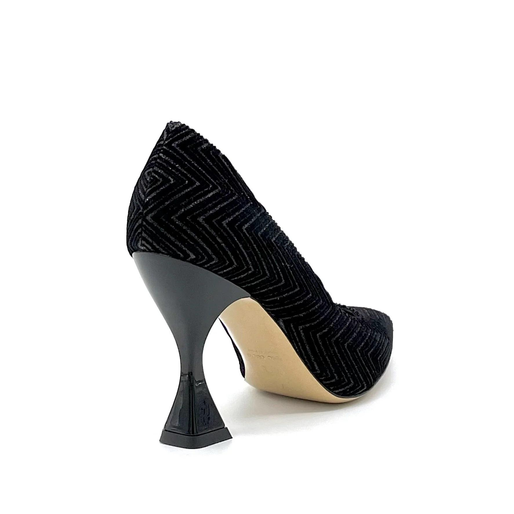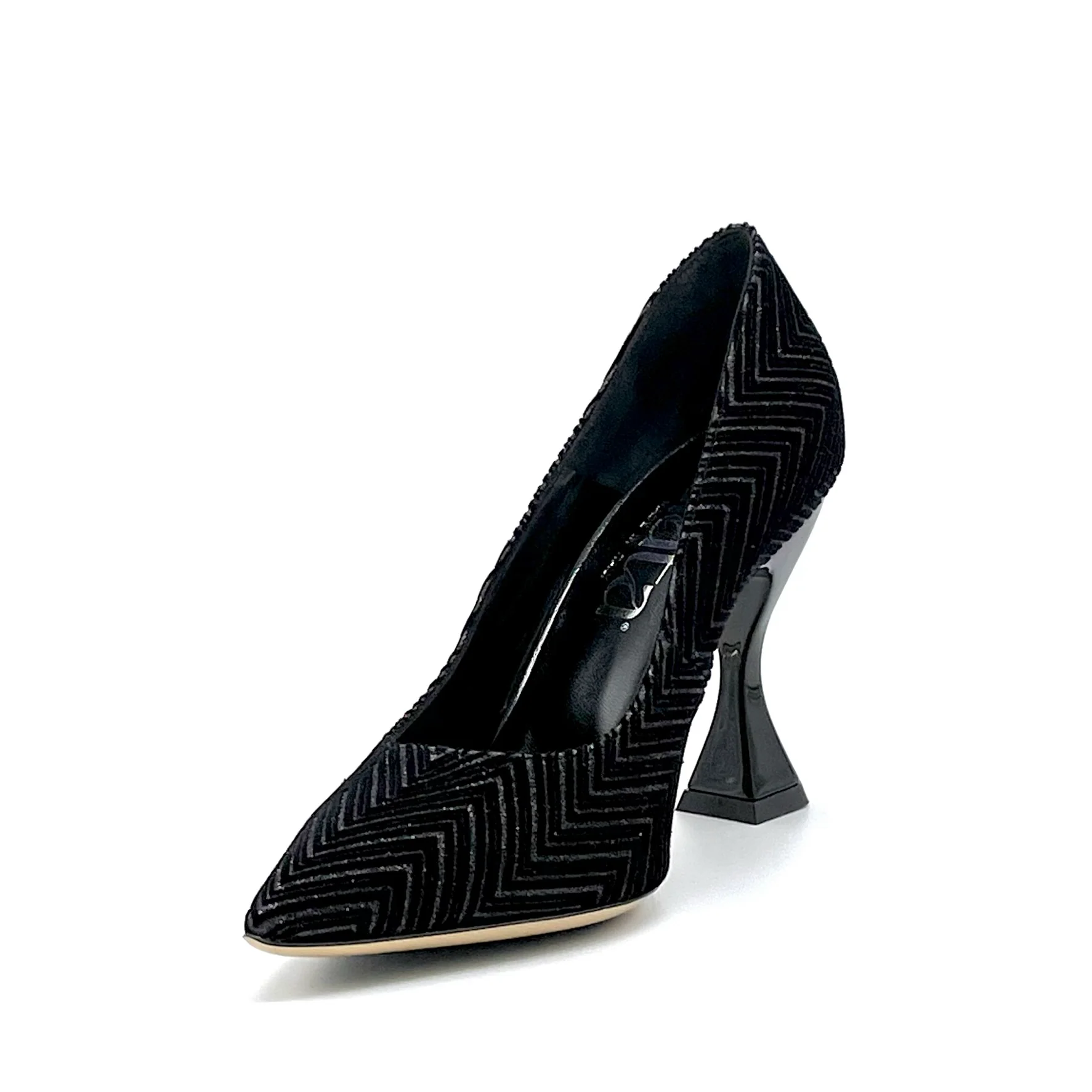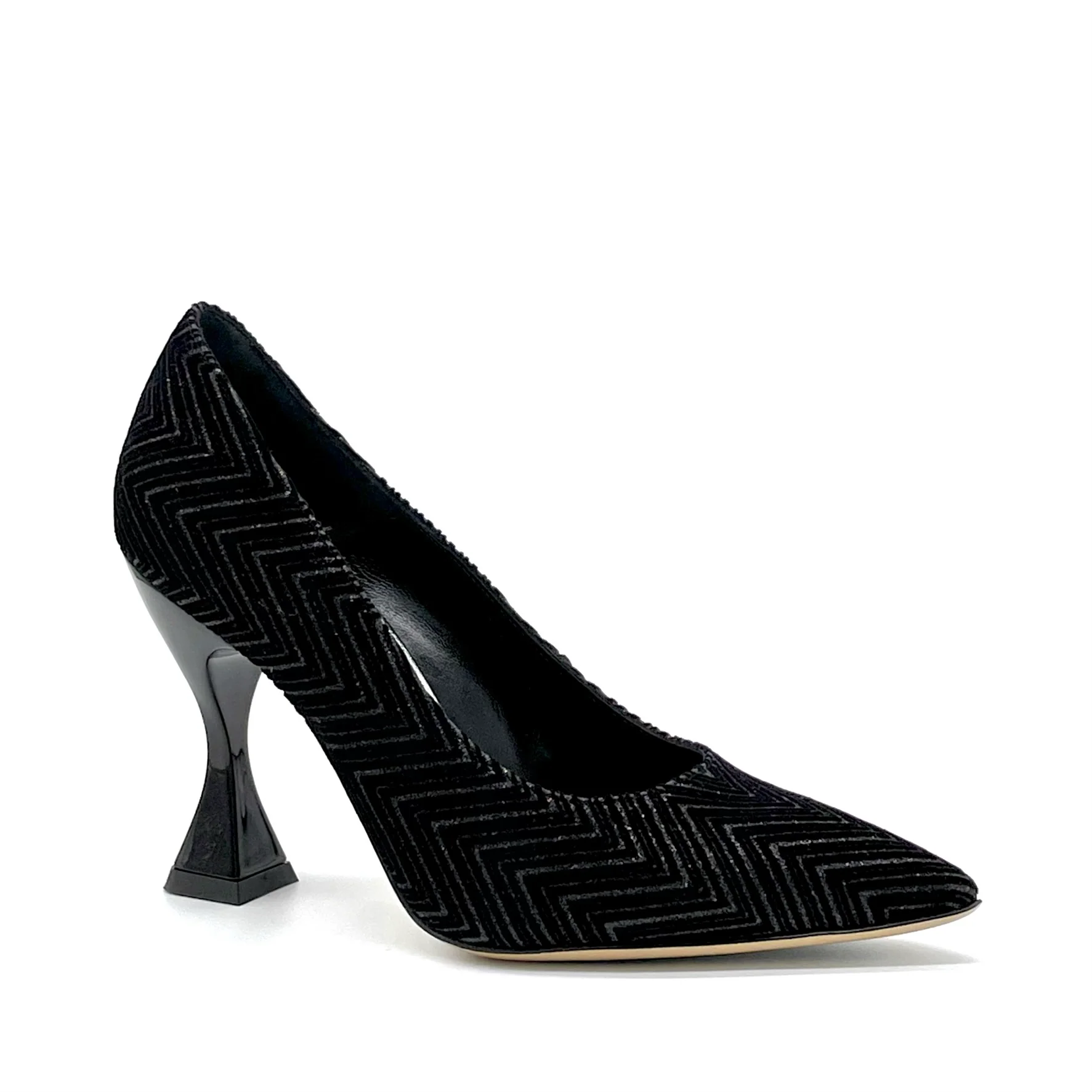 Décolleté in velluto glitter nero. Fodera in pelle, suola in cuoio e gomma. Altezza tacco 9,5 cm.