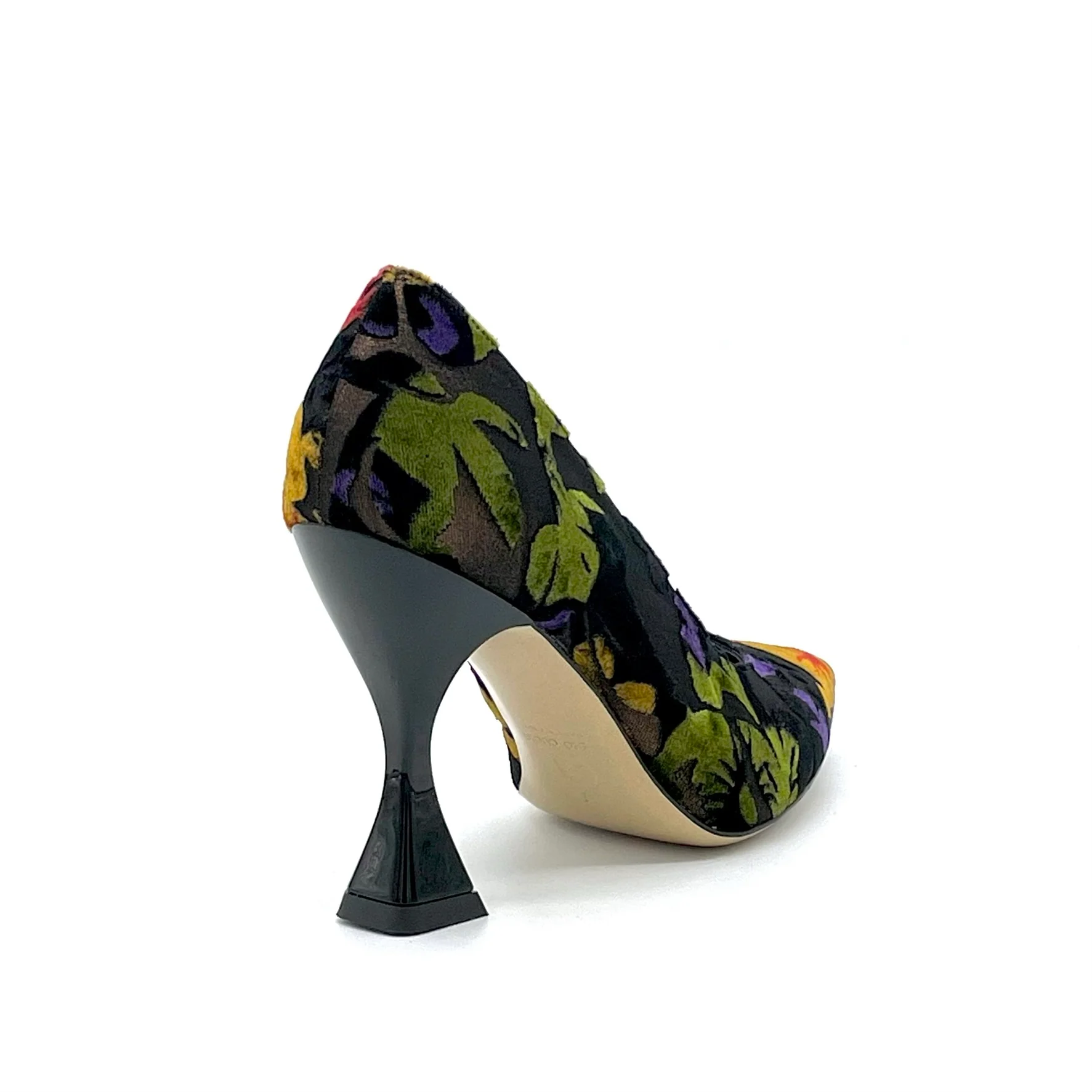 Décolleté in velluto operato a fiori. Fodera in pelle, suola in cuoio e gomma. Altezza tacco 9,5 cm.
