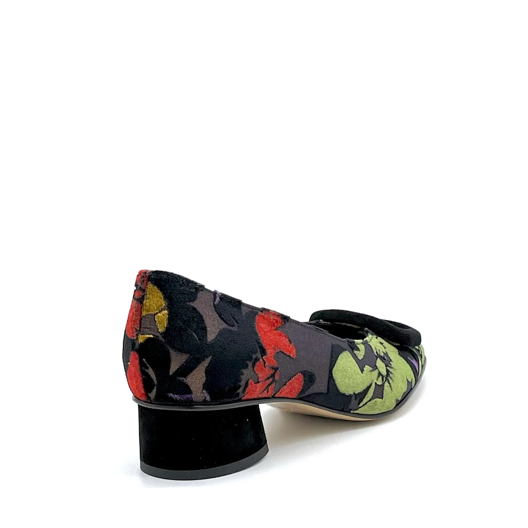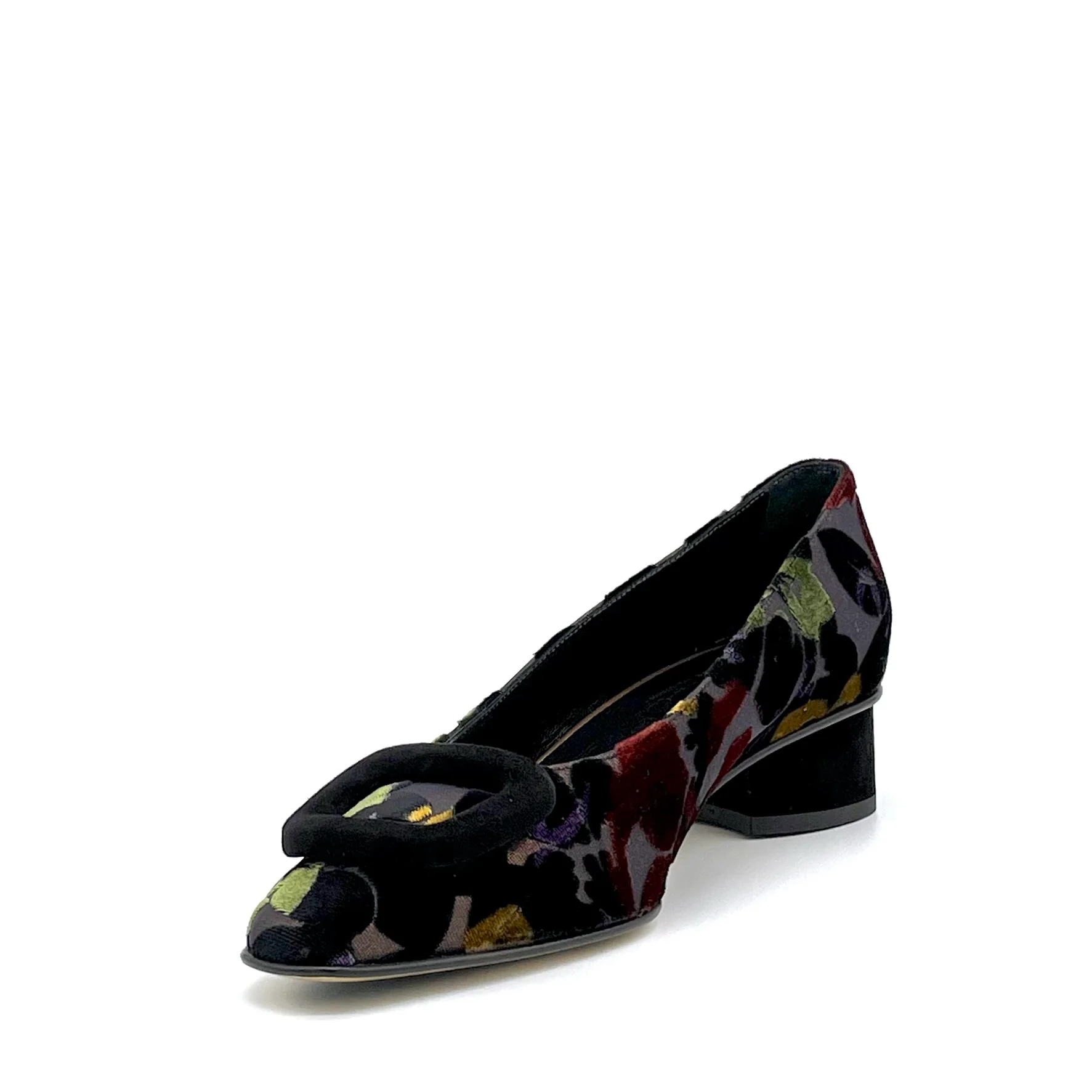 Décolleté in velluto operato con fibbia in camoscio nero. Fodera in pelle, suola in cuoio e gomma. Altezza tacco 3,5 cm.