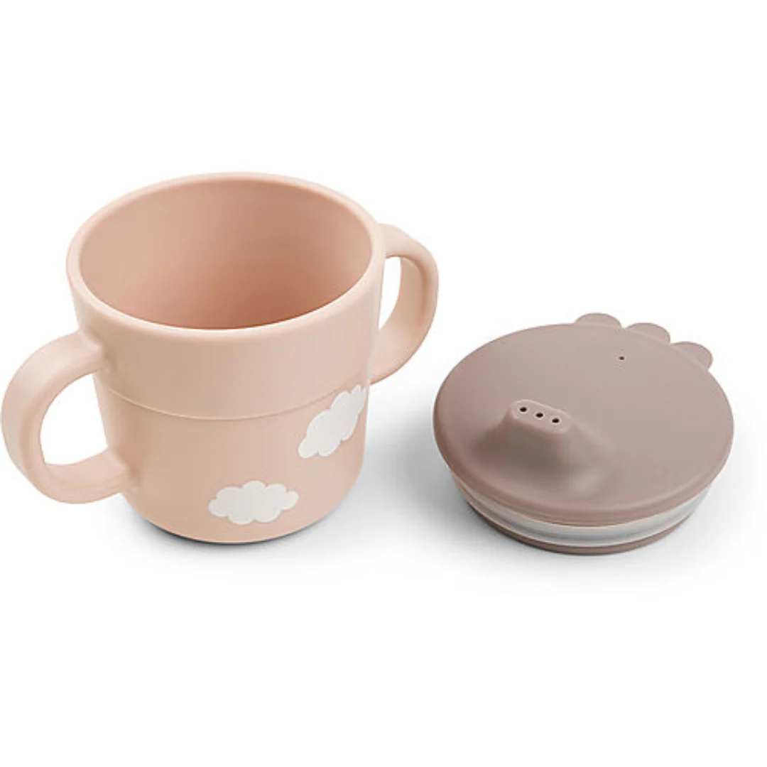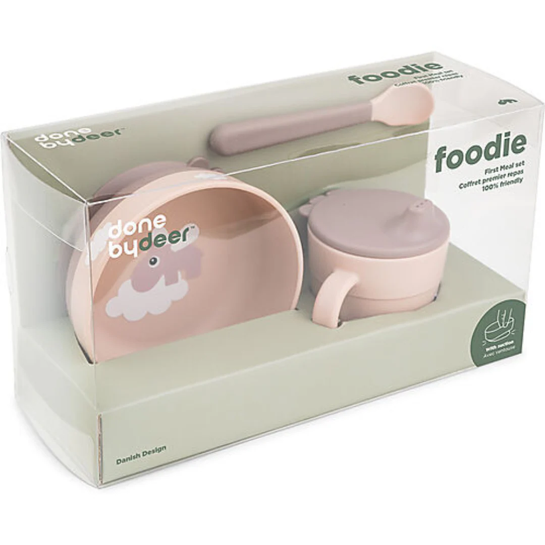 Il Done by Deer Set Pappa Foodie Happy Clouds in versione rosa è un set di stoviglie progettato per accompagnare le prime esperienze alimentari dei bambini. Include una ciotola con base antiscivolo, un bicchiere con manici e un cucchiaino ergonomico.