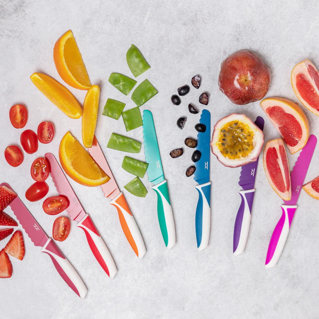Questo coltello è stato vincitore di numerosi premi come miglior accessorio da cucina per adulti e bambini. La sua lama in acciaio inox rivestita in materiale ceramico antiaderente, l’impugnatura antiscivolo in polipropilene BPA FREE e il design leggero e maneggevole lo rendono perfetto per i bambini a partire dai 3 anni.