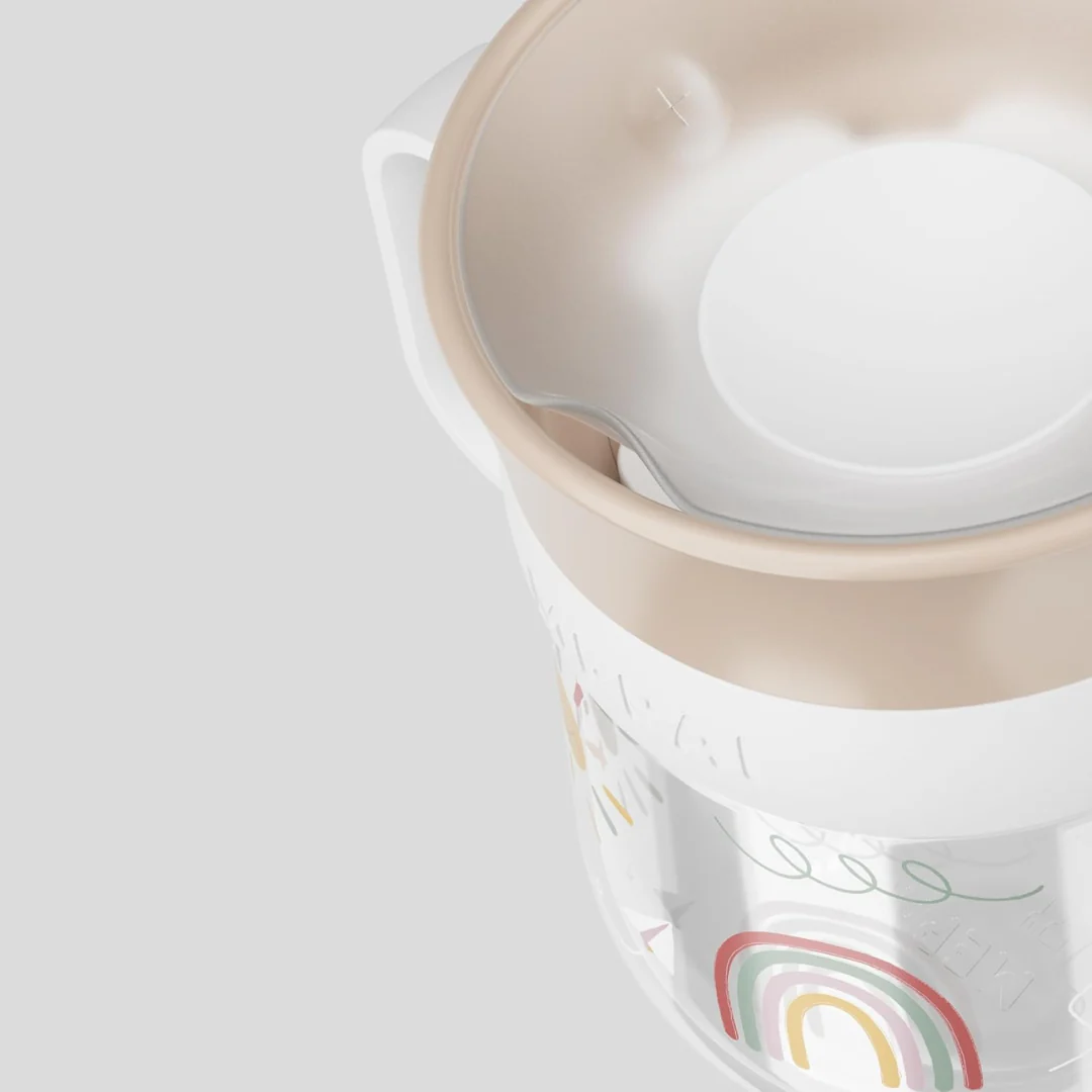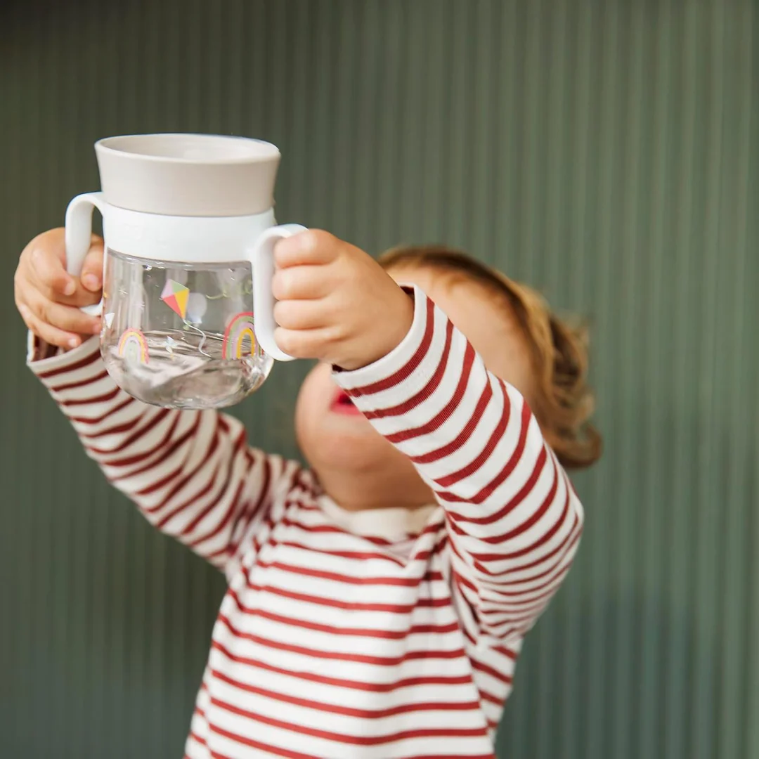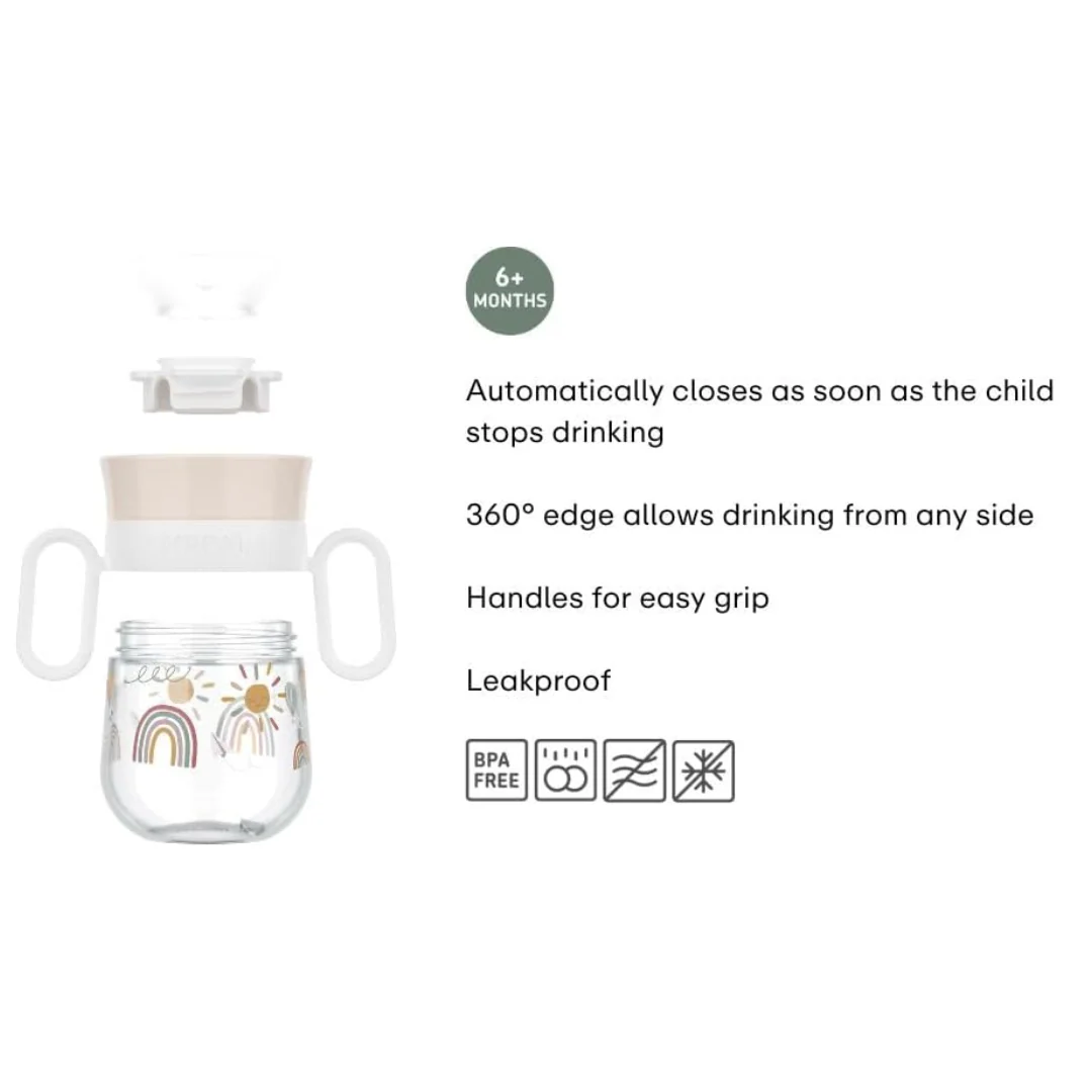 La tecnologia 360° lascia passare il liquido da qualunque parte della circonferenza e si sigilla automaticamente dopo aver bevuto grazie alla valvola anti-fuoriuscite. Ha due comodi manici removibili, per adattarsi ad ogni fase di sviluppo del bambino e permettergli di sperimentare in modo indipendente.