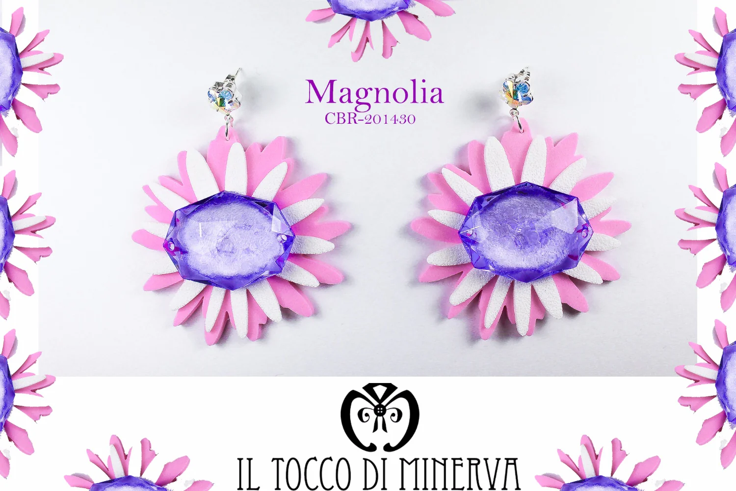 Orecchini realizzati a mano bianchi/rosa.Orecchini leggerissimi perchè realizzati con con una gomma particolare anallergica.Gli orecchini Magnolia in resina viola e argento 925 sono leggerissimi e hanno monachelle a lobo in cristallo swarovski trasparente.Alti solo 8 cm.