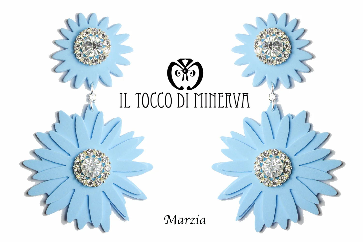 Orecchini realizzati a mano in moosgommi celeste.Orecchini realizzati con una particolare gomma anallergica impreziositi da strass trasparenti e cristallo swarovski centraleOrecchini alti 12cm.