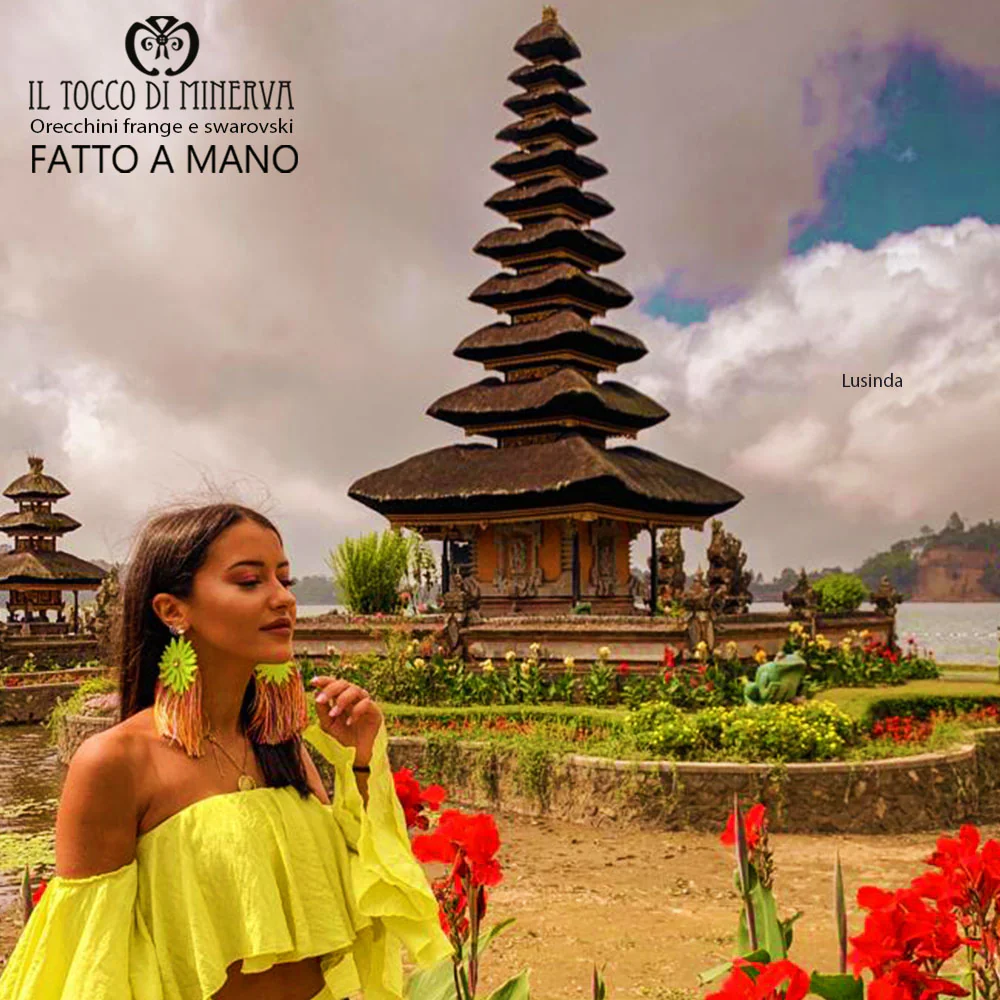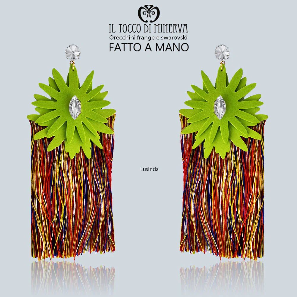 Orecchini realizzati a mano con frange multicolore e cristalli swarovski a lobo e al centro del fiore. Il fiore verde è possibile averlo di tutti i colori, previa comunicazione via mail o al momento dell’acquisto. L’orecchino Lusinda è alto 16 dal cristallo a lobo sino alla punta della frangia. E’ possibile averlo anche più corto.