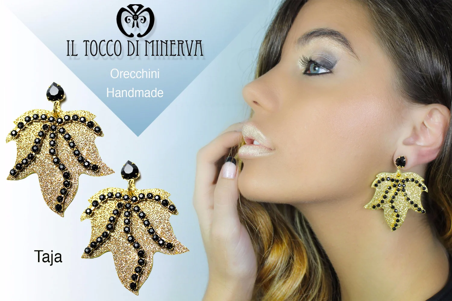 Orecchini a forma di foglia in moosgummi effetto lurex.Orecchini color oro e nero inprezziosito da strass e cristallo swarovski nero a lobo. Ideali per la festa della mamma o per San ValentinoL’orecchino è alto 6 cm.