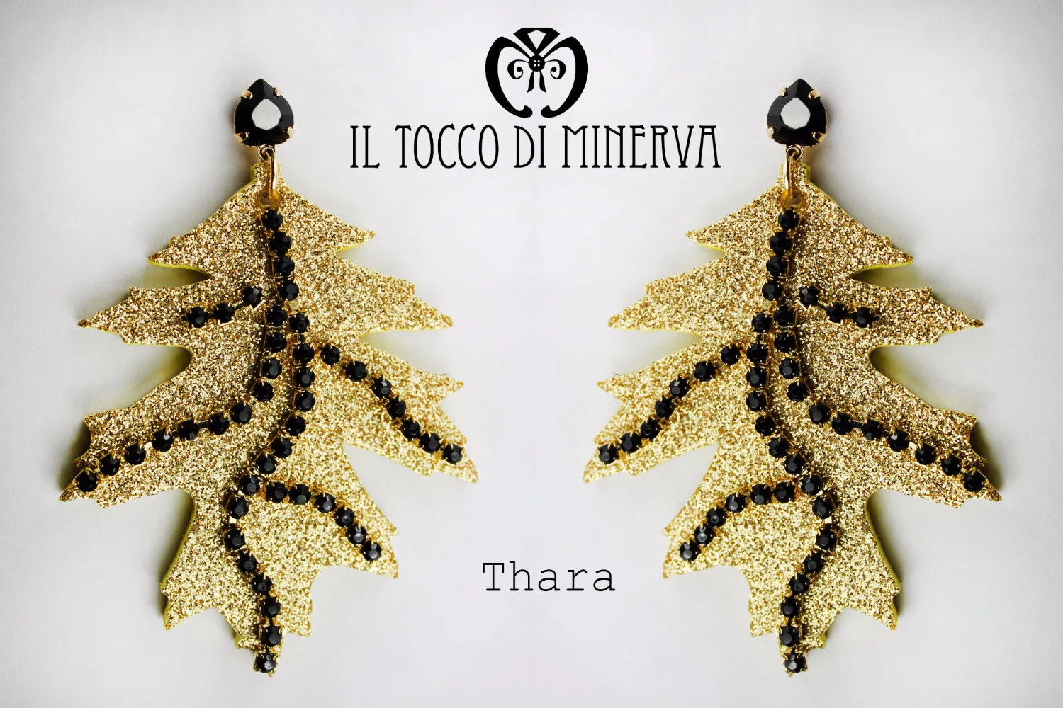Orecchini a forma di foglia in moosgummi effetto lurex.Orecchini color oro e nero inprezziosito da strass e cristallo swarovski nero a lobo.L’orecchino è alto 6 cm.