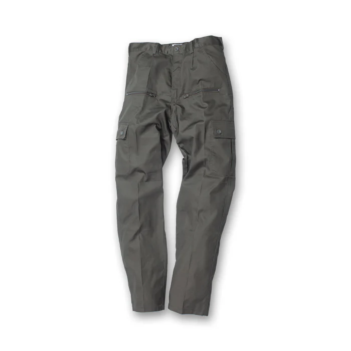 Ampie tasche posteriori e tasconi a coscia con pattina chiusa da bottoni.
