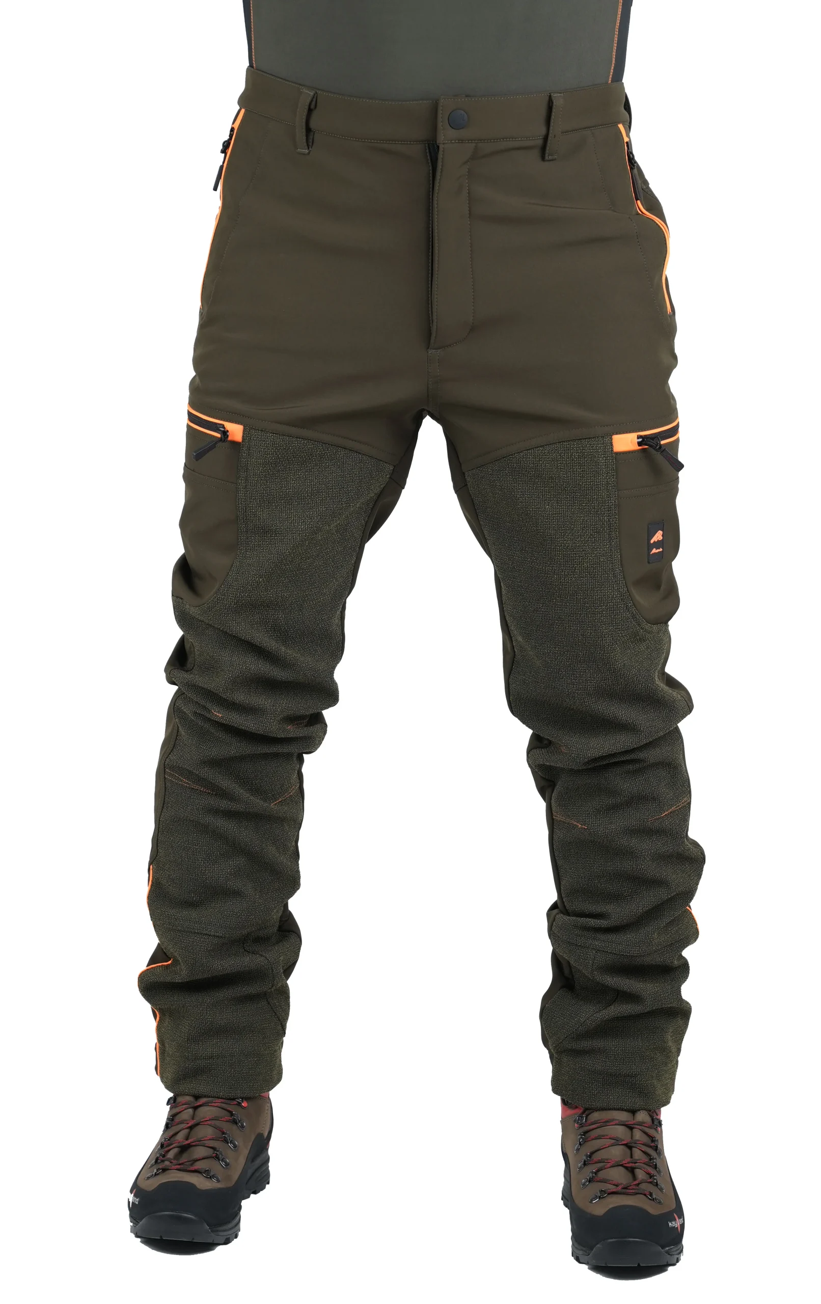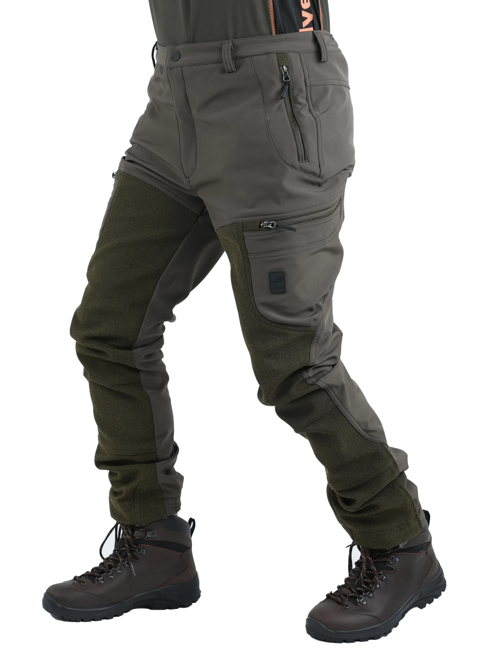 Comodo pantalone da caccia impermeabile e traspirante realizzato in softshell elasticizzato doppiato in pile e membrana M-tex.