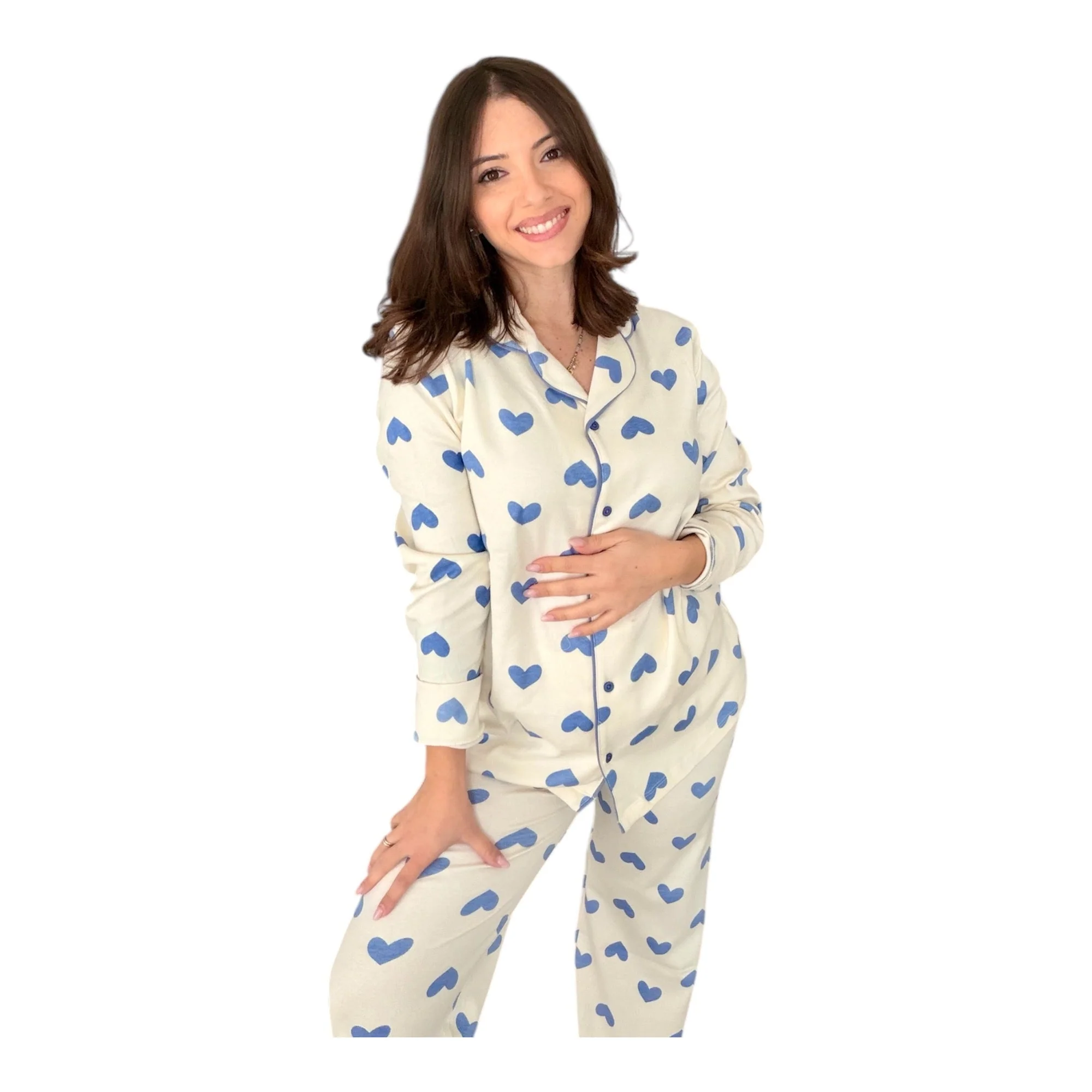 Il modello presenta una comoda apertura frontale con bottoni, ideale anche per chi cerca maggiore praticità, ad esempio durante l’allattamento o la degenza. L’assenza di polsini dona libertà nei movimenti e una vestibilità più fluida, mantenendo uno stile essenziale ma elegante.