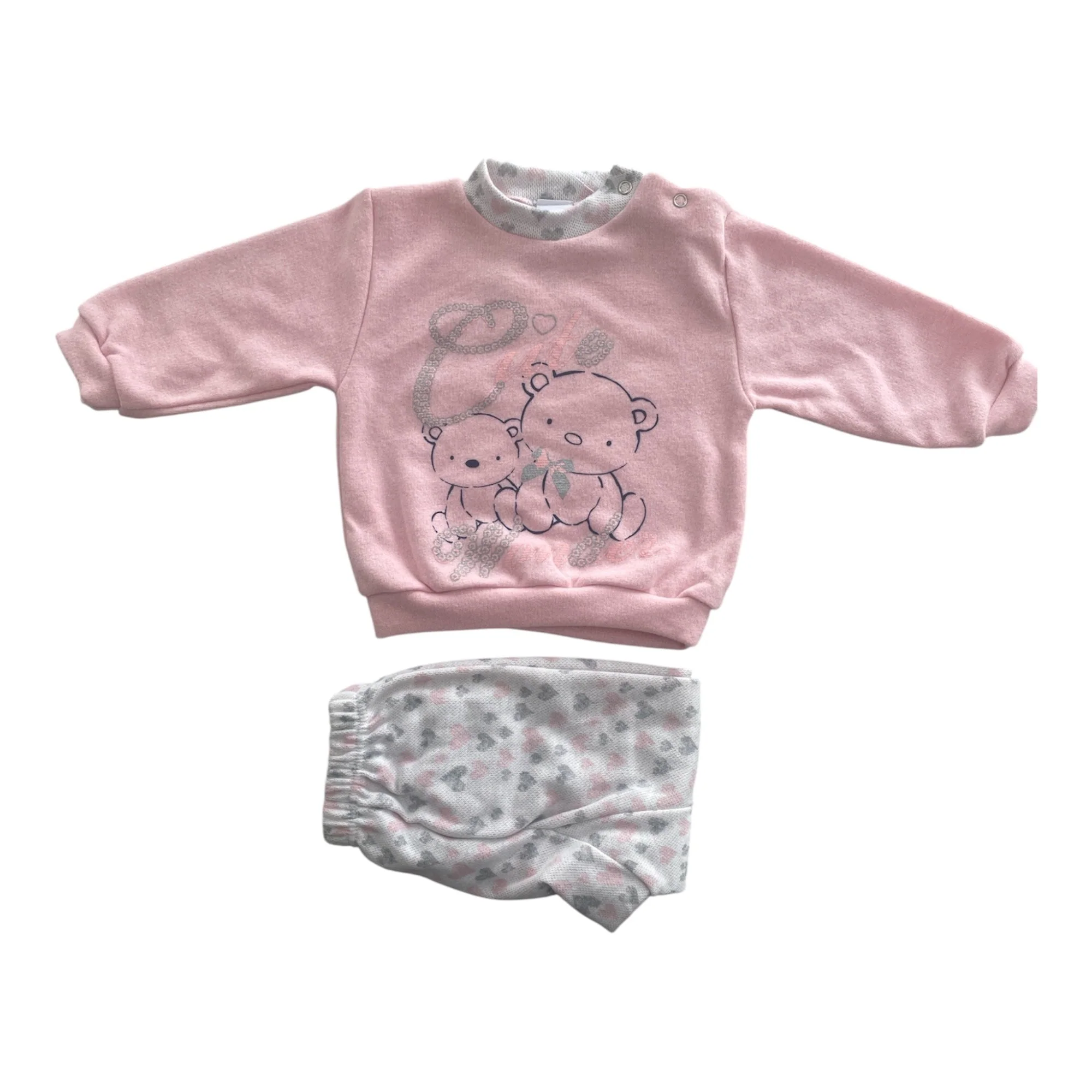 La maglia a girocollo presenta una comoda apertura sulla spalla con bottoncini, che rende facile la vestizione e il cambio. I pantaloni lunghi con elastico morbido in vita completano l’outfit, assicurando una vestibilità sicura ma delicata.