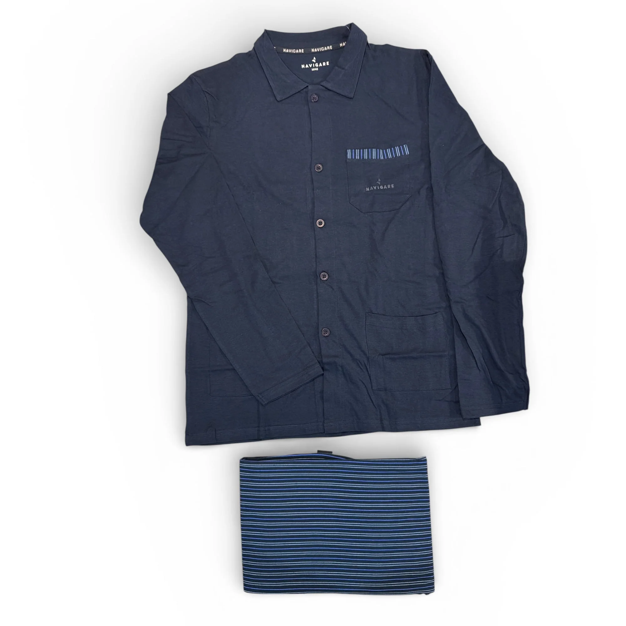 Il pigiama uomo lungo Navigare Art.141981 è realizzato in cotone jersey, un tessuto morbido e traspirante che assicura comfort e benessere durante il riposo. Il modello aperto davanti con chiusura a bottoni è pratico e funzionale, ideale per chi cerca comodità e semplicità senza rinunciare allo stile.