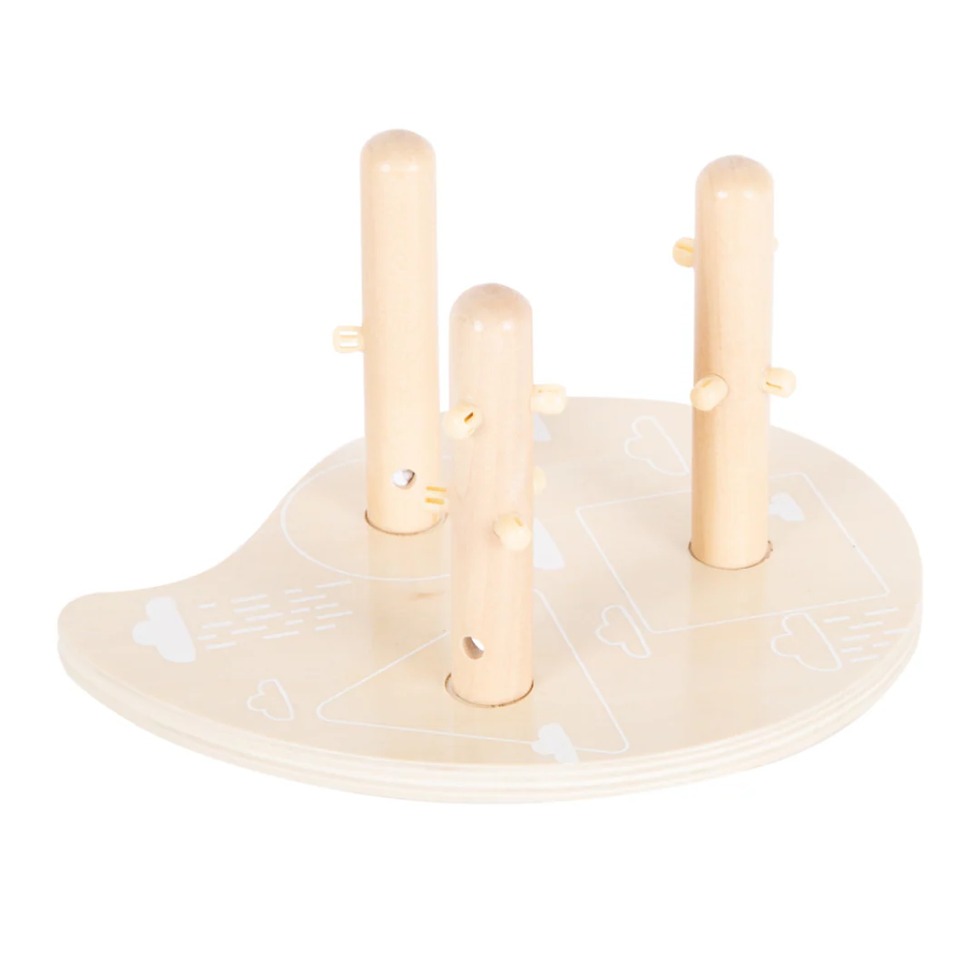 Un divertente gioco di incastri in legno, che stimola moltissimo la motricità fine e la coordinazione, ed insegna al bambino ad avvitare, svitare e incastrare