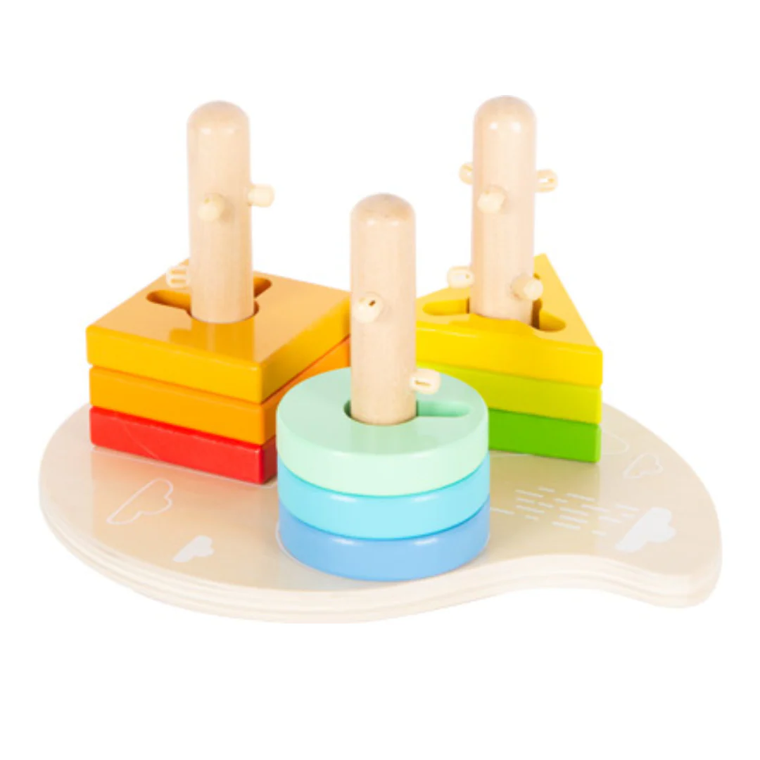 Una base in legno con due torri con filettatura e tre torri con diversi perni sfasati dove incastrare o avvitare le diverse forme geometriche colorate. Il gioco ideale per imparare a riconoscere le forme geometriche.