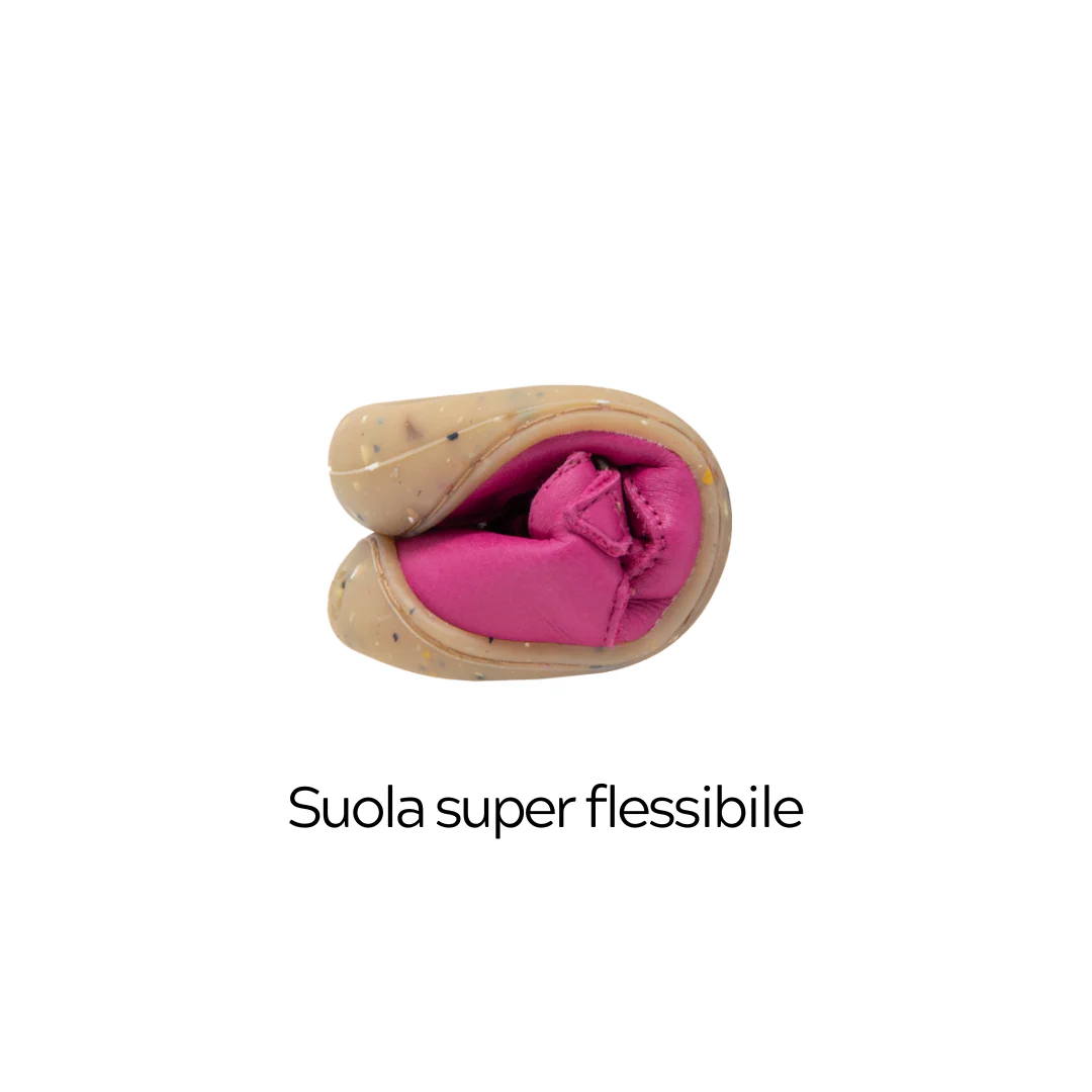 Il design è pensato per il benessere e lo sviluppo naturale del piede del bambino: dalla toebox ampia e confortevole, che lascia spazio per il movimento delle dita e migliora la stabilità, fino al tallone e punta al medesimo livello per promuovere un equilibrio ottimale.