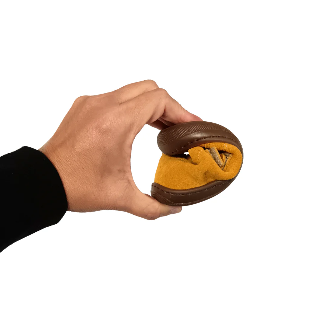 La suola in gomma flessibile consente al piede di muoversi in modo naturale, distribuendo il carico in modo uniforme e permettendo una postura spontanea senza irrigidire l’appoggio. La forma della punta lascia spazio alle dita, contribuendo a una calzata stabile e comoda.