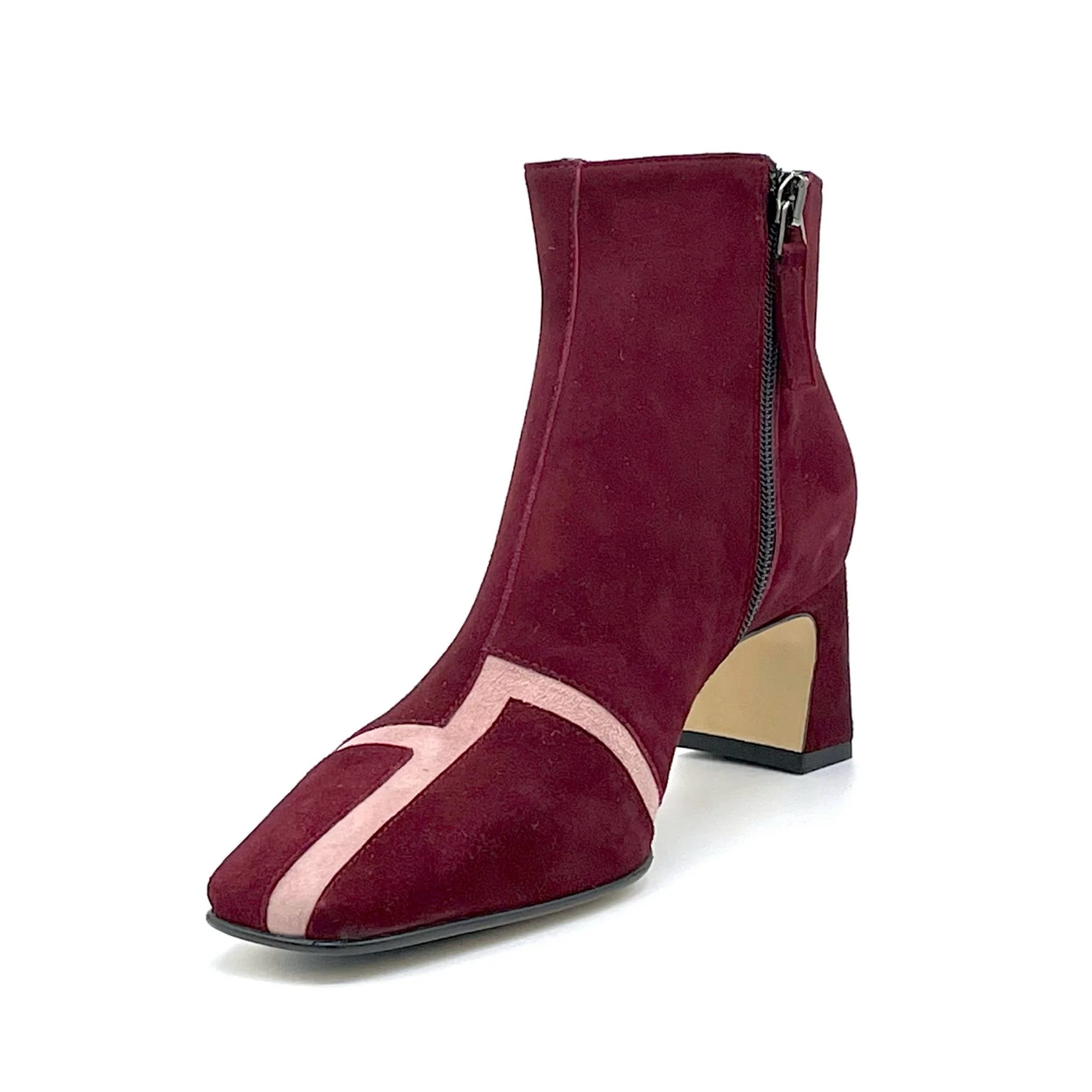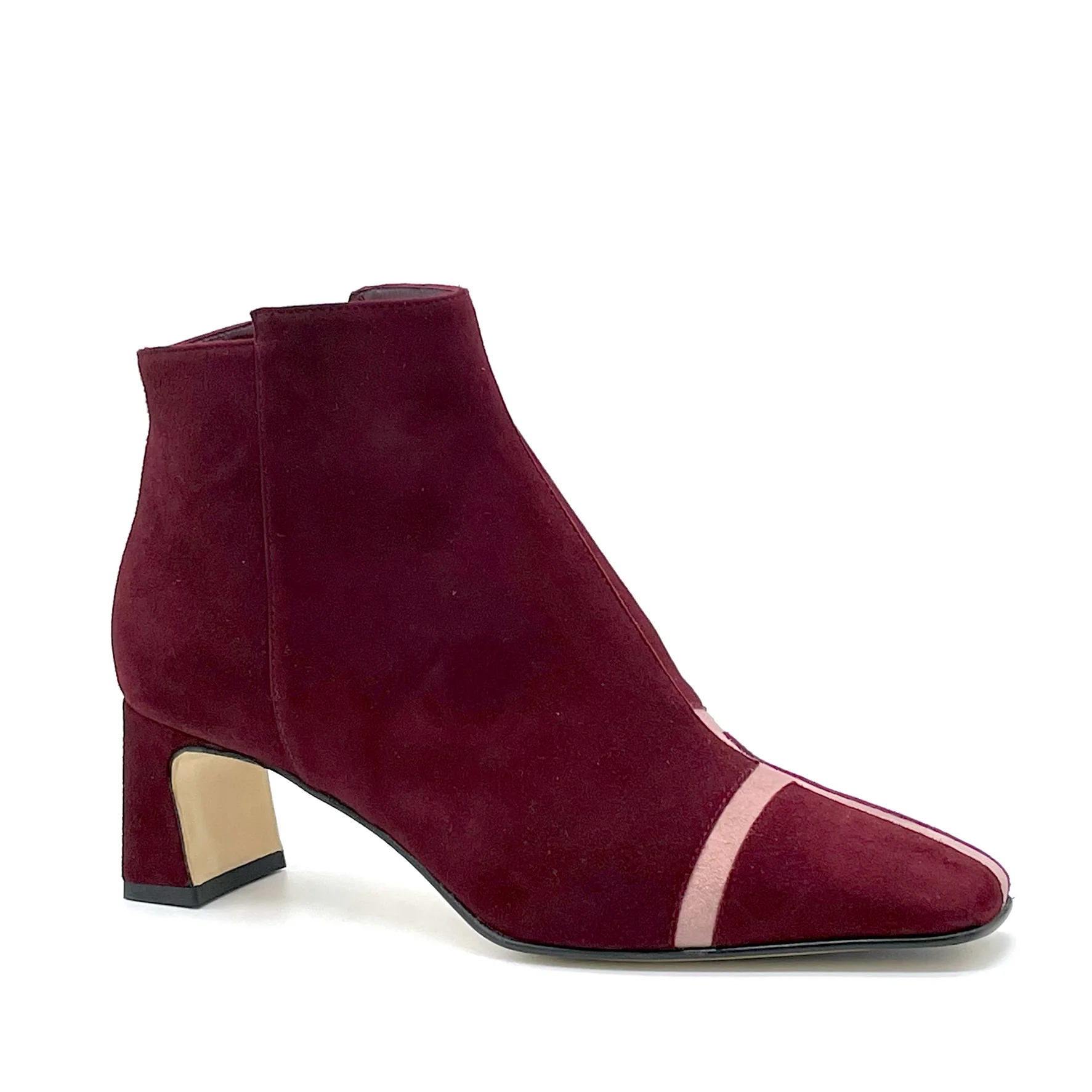 Stivaletto in camoscio Bordeaux e rosa chiaro. Fodera in pelle, suola in cuoio e gomma. Altezza tacco 5,5 cm.