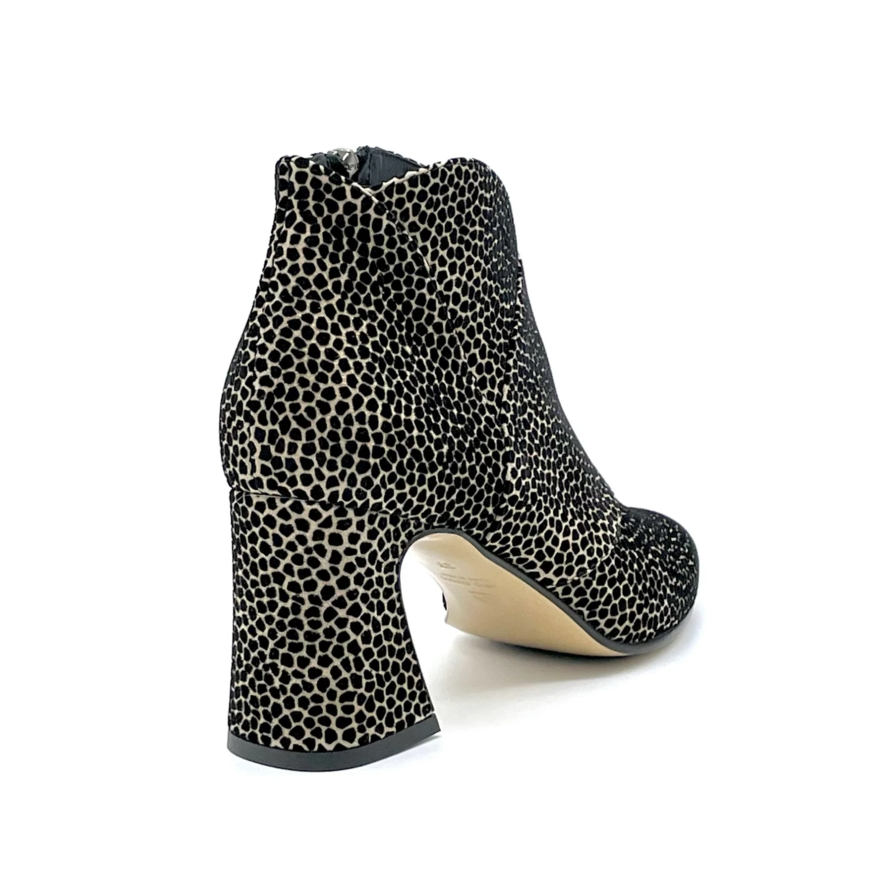 Stivaletto in camoscio stampato crema e nero. Fodera in pelle, suola in cuoio e gomma. Altezza tacco 7,5 cm.