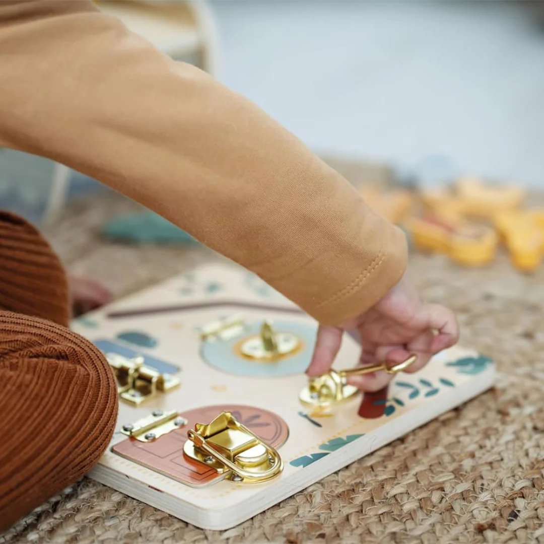Questa tavoletta di motricità in legno offre ai bambini piccoli svariate possibilità di gioco e apprendimento.