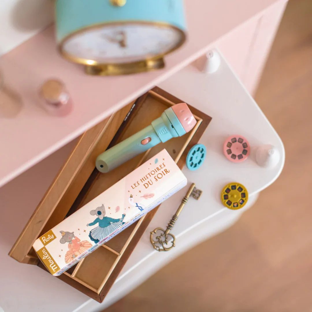La Torcia Raccontastorie Moulin Roty è una lampada proietta storie della buonanotte che incanta i bambini con favole proiettate.