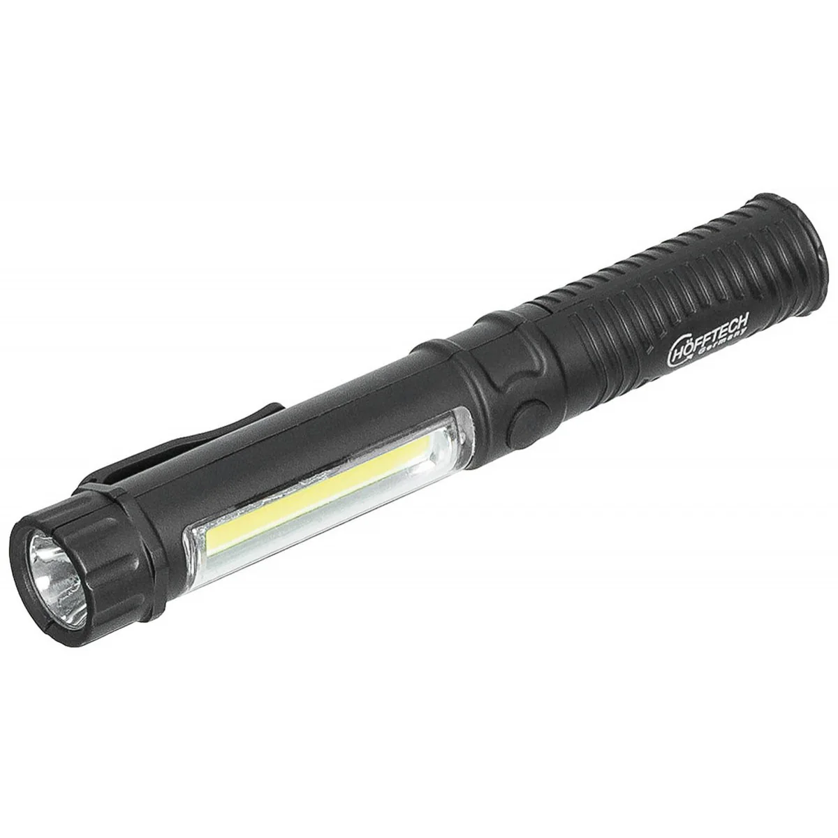 La torcia LED Sottile ha: 1 LED bianco (1 watt) per luce continua, 1 LED laterale (1,5 watt) per illuminazione continua, robusto alloggiamento in plastica, impugnatura magnetica e un