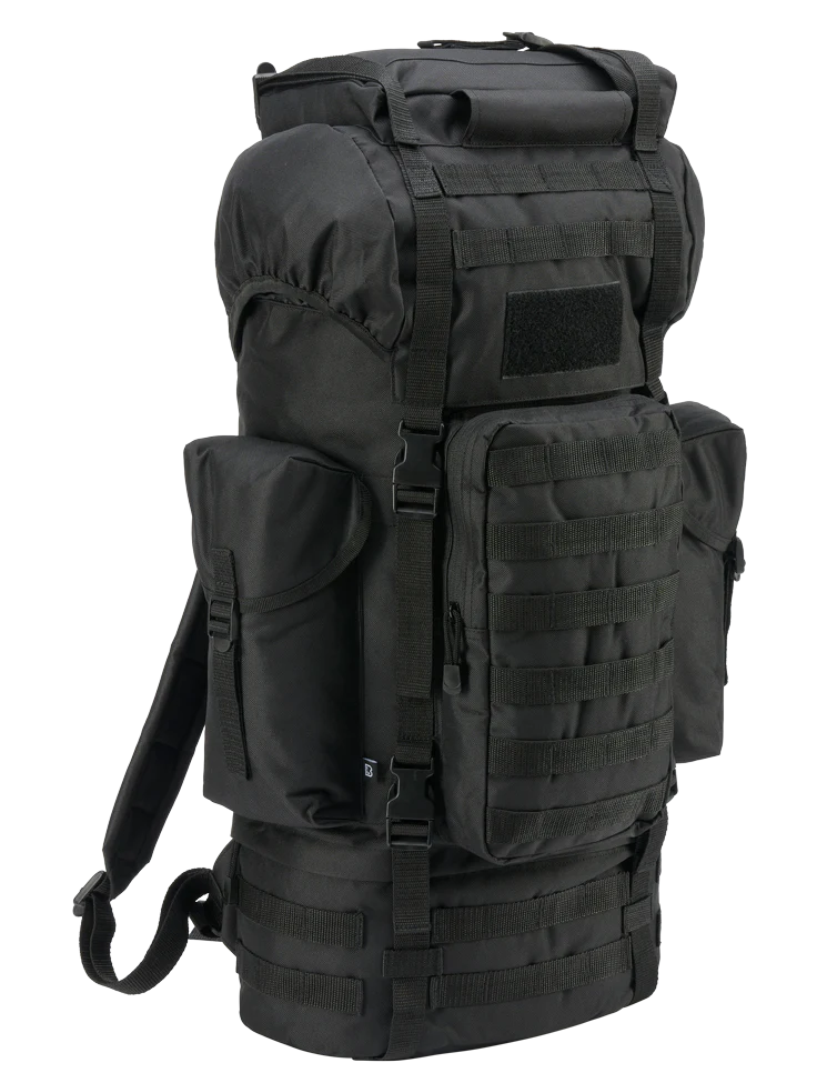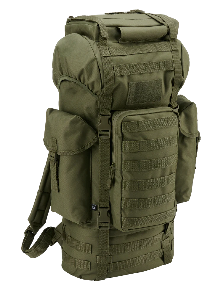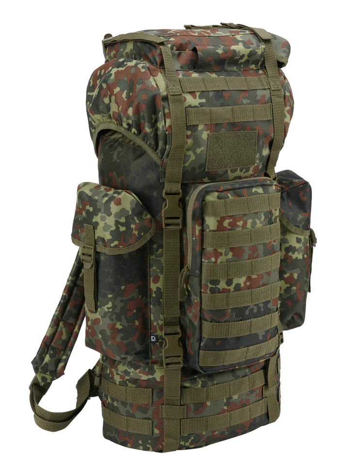 Sistema Molle, spallacci imbottiti, bauletto e tasche laterali.Ampio scomparto principale e ampio scomparto per scarpe nella parte inferiore.Colori Disponibili: Verde, Woodland, Flecktarn e Nero.